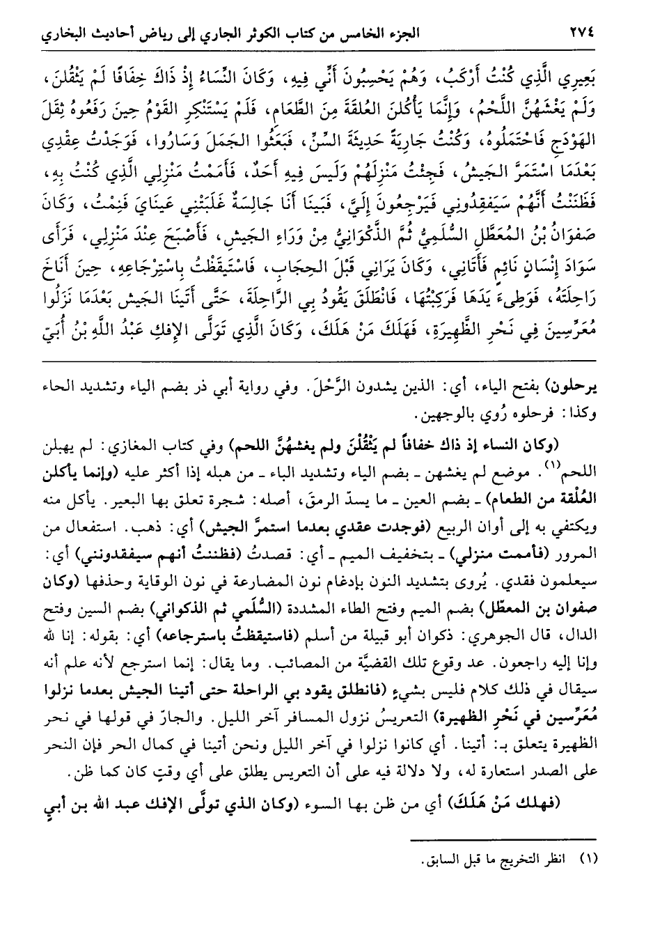(وكان النساء إذ ذاك خفافًا لم يَثْقُلْنَ ولم يغشهُنَّ اللحم) وفي كتاب المغازي: لم يهبلن اللحم. موضع لم يغشهن -بضم الياء وتشديد الباء- من هبله إذا أكثر عليه (وإنما يأكلن العُلْقة من الطعام) -بضم العين- ما يسدّ الرمقَ، أصله: شجرة تعلق بها البعير. يأكل منه ويكتفي به إلى أوان الربيع (فوجدت عقدي بعدما استمرَّ الجيش) أي: ذهب. استفعال من المرور (فأممت منزلي) -بتخفيف الميم- أي: قصدتُ (فظننتُ أنهم سيفقدونني) أي: سيعلمون فقدي. يُروى بتشديد النون بإدغام نون المضارعة في نون الوقاية وحذفها (وكان صفوان بن المعطّل) بضم الميم وفتح الطاء المشددة (السُّلَمي ثم الذكواني) بضم السين وفتح الدال، قال الجوهري: ذكوان أبو قبيلة من أسلم (فاستيقظتُ باسترجاعه) أي: بقوله: إنا لله وإنا إليه راجعون. عد وقوع تلك القضيَّة من المصائب. وما يقال: إنما استرجع لأنه علم أنه سيقال في ذلك كلام فليس بشيء (فانطلق يقود بي الراحلة حتى أتينا الجيش بعدما نزلوا مُعَرِّسين في نَحْرِ الظهيرة) التعريسُ نزول المسافر آخر الليل. والجارّ في قولها في نحر الظهيرة يتعلق بـ: أتينا. أي كانوا نزلوا في آخر الليل ونحن أتينا في كمال الحر فإن النحر على الصدر استعارة له، ولا دلالة فيه على أن التعريس يطلق على أي وقتٍ كان كما ظن.