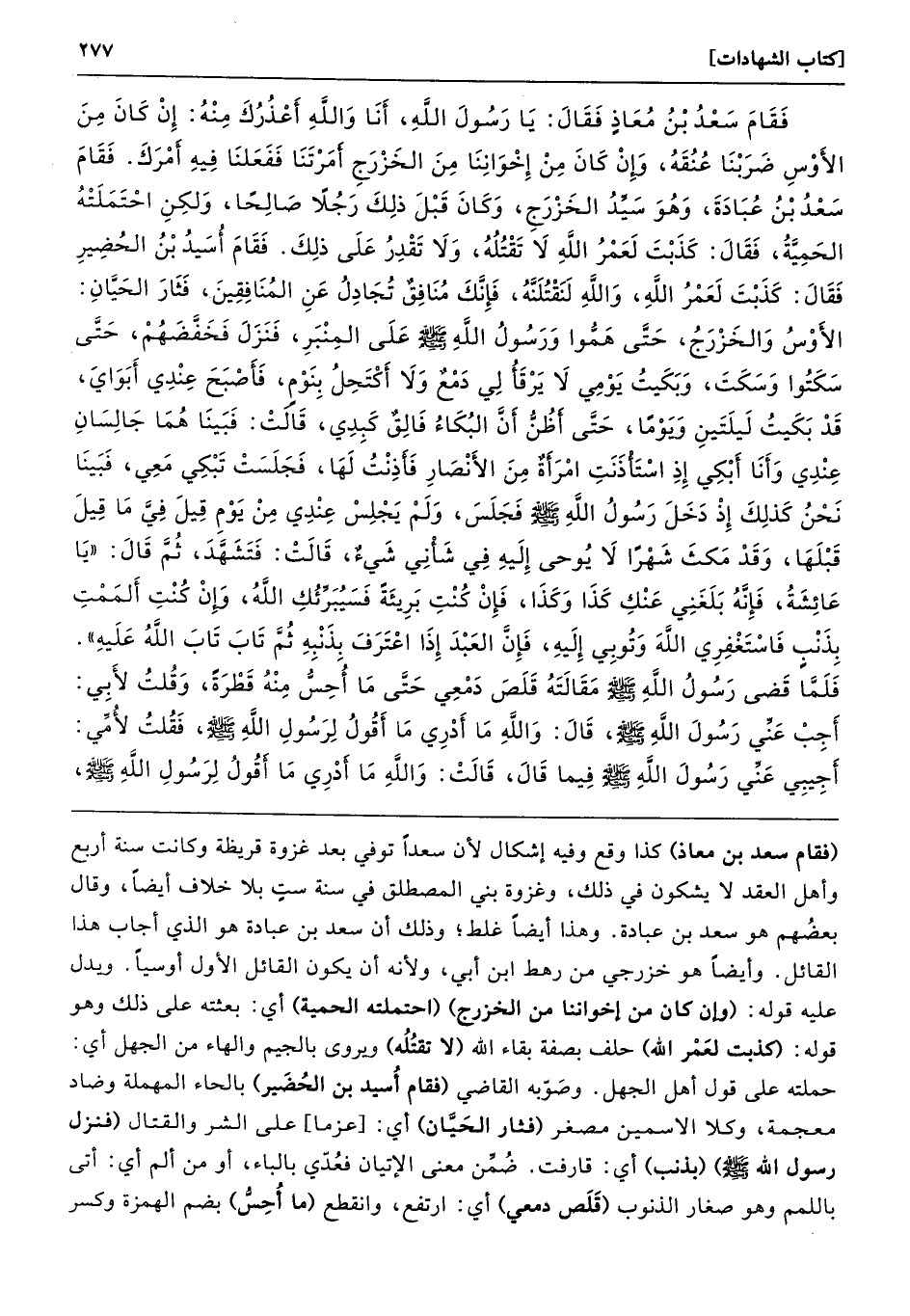 فَقَامَ سَعْدُ بْنُ مُعَاذٍ فَقَالَ يَا رَسُولَ اللَّهِ أَنَا وَاللَّهِ أَعْذِرُكَ مِنْهُ، إِنْ كَانَ مِنَ الأَوْسِ ضَرَبْنَا عُنُقَهُ، وَإِنْ كَانَ مِنْ إِخْوَانِنَا مِنَ الْخَزْرَجِ أَمَرْتَنَا فَفَعَلْنَا فِيهِ أَمْرَكَ. فَقَامَ سَعْدُ بْنُ عُبَادَةَ وَهُوَ سَيِّدُ الْخَزْرَجِ، وَكَانَ قَبْلَ ذَلِكَ رَجُلاً صَالِحًا وَلَكِنِ احْتَمَلَتْهُ الْحَمِيَّةُ فَقَالَ كَذَبْتَ لَعَمْرُ اللَّهِ، لاَ تَقْتُلُهُ وَلاَ تَقْدِرُ عَلَى ذَلِكَ، فَقَامَ أُسَيْدُ بْنُ الْحُضَيْرِ فَقَالَ كَذَبْتَ لَعَمْرُ اللَّهِ، وَاللَّهِ لَنَقْتُلَنَّهُ، فَإِنَّكَ مُنَافِقٌ تُجَادِلُ عَنِ الْمُنَافِقِينَ. فَثَارَ الْحَيَّانِ الأَوْسُ وَالْخَزْرَجُ حَتَّى هَمُّوا، وَرَسُولُ اللَّهِ - صلى الله عليه وسلم - عَلَى الْمِنْبَرِ فَنَزَلَ فَخَفَّضَهُمْ حَتَّى سَكَتُوا وَسَكَتَ، وَبَكَيْتُ يَوْمِى لاَ يَرْقَأُ لِى دَمْعٌ وَلاَ أَكْتَحِلُ بِنَوْمٍ، فَأَصْبَحَ عِنْدِى أَبَوَاىَ، قَدْ بَكَيْتُ لَيْلَتَيْنِ وَيَوْمًا حَتَّى أَظُنُّ أَنَّ الْبُكَاءَ فَالِقٌ كَبِدِى - قَالَتْ - فَبَيْنَا هُمَا جَالِسَانِ عِنْدِى وَأَنَا أَبْكِى إِذِ اسْتَأْذَنَتِ امْرَأَةٌ مِنَ الأَنْصَارِ فَأَذِنْتُ لَهَا، فَجَلَسَتْ تَبْكِى مَعِى، فَبَيْنَا نَحْنُ كَذَلِكَ إِذْ دَخَلَ رَسُولُ اللَّهِ - صلى الله عليه وسلم - فَجَلَسَ، وَلَمْ يَجْلِسْ عِنْدِى مِنْ يَوْمِ قِيلَ فِىَّ مَا قِيلَ قَبْلَهَا، وَقَدْ مَكُثَ شَهْرًا لاَ يُوحَى إِلَيْهِ فِي شَأْنِى شَىْءٌ - قَالَتْ - فَتَشَهَّدَ ثُمَّ قَالَ «يَا عَائِشَةُ فَإِنَّهُ بَلَغَنِى عَنْكِ كَذَا وَكَذَا، فَإِنْ كُنْتِ بَرِيئَةً فَسَيُبَرِّئُكِ اللَّهُ، وَإِنْ كُنْتِ أَلْمَمْتِ فَاسْتَغْفِرِى اللَّهَ وَتُوبِى إِلَيْهِ، فَإِنَّ الْعَبْدَ إِذَا اعْتَرَفَ بِذَنْبِهِ ثُمَّ تَابَ تَابَ اللَّهُ عَلَيْهِ». فَلَمَّا قَضَى رَسُولُ اللَّهِ - صلى الله عليه وسلم - مَقَالَتَهُ قَلَصَ دَمْعِى حَتَّى مَا أُحِسُّ مِنْهُ قَطْرَةً وَقُلْتُ لأَبِى أَجِبْ عَنِّى رَسُولَ اللَّهِ - صلى الله عليه وسلم -. قَالَ وَاللَّهِ مَا أَدْرِى مَا أَقُولُ لِرَسُولِ اللَّهِ - صلى الله عليه وسلم -.