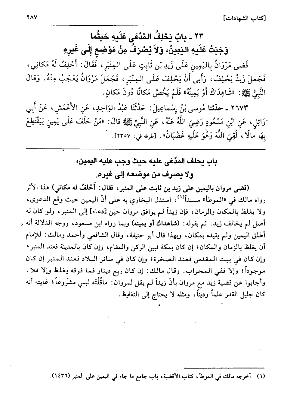 باب يحلف المدَّعَى عليه حيث وجب عليه اليمين، ولا يصرف من موضعه إلى غيره. (قضى مروان باليمين على زيد بن ثابت على المنبر، فقال: أَحْلفُ له مكاني) هذا الأثر رواه مالك في "الموطأ" مسندًا، استدل البخاري به على أن اليمين حيث وقع الدعوى، ولا يغلظ بالمكان والزمان، فإن زيدًا لم يوافق مروان حين [دعاه] إلى المنبر، ولو كان له أصل لم يخالف زيد. ثم بقوله: (شاهداك أو يمينه) وبما رواه ابن مسعود، ووجه الدلالة أنه أطلق اليمين ولم يقيده بمكان، وبهذا قال أبو حنيفة، وقال الشافعي وأحمد ومالك: للإمام أن يغلظ بالزمان والمكان؛ إن كان بمكة فبين الركن والمقام، وإن كان بالمدينة فعند المنبر؛ وإن كان في بيت المقدس فعند الصخرة؛ وإن كان في سائر البلاد فعند المنبر إن كان موجودًا؛ وإلا ففي المحراب. وقال مالك: إن كان ربع دينار فما فوقه يغلظ وإلا فلا. وأجابوا عن قضية زيد مع مروان بأنّ زيدًا لم يقل لمروان: ما قُلْتَه ليس مشروعًا؛ غايته أنه كان جليل القدر علمًا ودينًا، ومثله لا يحتاج إلى التغليظ.