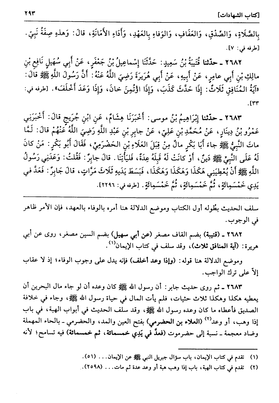 2683 - ثم روى حديث جابر: أن رسول الله - صلى الله عليه وسلم - كان وعده أن لو جاء مال البحرين أن يعطيه هكذا وهكذا ثلاث حثيات، فلم يأت المال في حياة رسول الله - صلى الله عليه وسلم -، وجاء في خلافة الصديق فأعطاه ما كان وعده رسول الله - صلى الله عليه وسلم -، وقد سلف الحديث في أبواب الهبة، في باب إذا وهب، أو وعد (العلاء بن الحضرمي) بفتح العين والمد، والحضرمي -بالحاء المهملة وضاد معجمة- نسبة إلى حضرموت (فعدَّ في يَدِي خمسمائة، ثم خمسمائة) فيه تسامح؛ لأنه