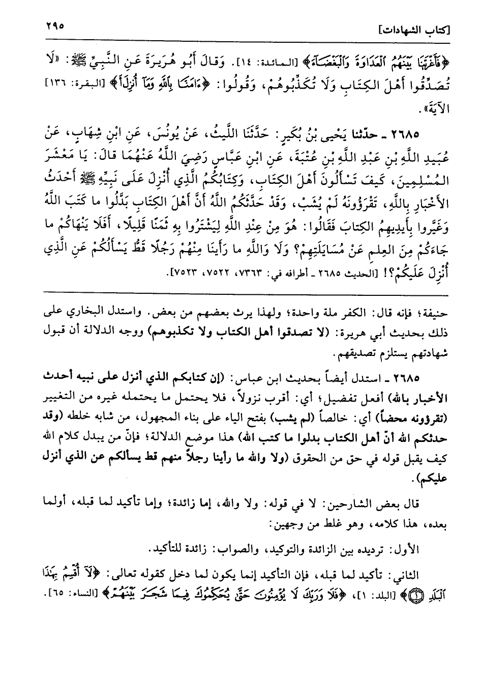 2685 - استدل أيضًا بحديث ابن عباس: (إن كتابكم الذي أنزل على نبيه أحدث الأخبار بالله) أفعل تفضيل؛ أي: أقرب نزولًا، فلا يحتمل ما يحتمله غيره من التغيير (تقرؤونه محضًا) أي: خالصًا (لم يشب) بفتح الياء على بناء المجهول، من شابه خلطه (وقد حدثكم الله أن أهل الكتاب بدلوا ما كتب الله) هذا موضع الدلالة؛ فإنّ من يبدل كلام الله كيف يقبل قوله في حق من الحقوق (ولا والله ما رأينا رجلًا منهم قط يسألكم عن الذي أنزل عليكم).