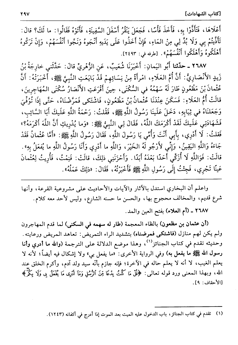 2687 - حَدَّثَنَا أَبُو الْيَمَانِ أَخْبَرَنَا شُعَيْبٌ عَنِ الزُّهْرِىِّ قَالَ حَدَّثَنِى خَارِجَةُ بْنُ زَيْدٍ الأَنْصَارِىُّ أَنَّ أُمَّ الْعَلاَءِ امْرَأَةً مِنْ نِسَائِهِمْ قَدْ بَايَعَتِ النَّبِىَّ - صلى الله عليه وسلم - أَخْبَرَتْهُ أَنَّ عُثْمَانَ بْنَ مَظْعُونٍ طَارَ لَهُ سَهْمُهُ فِي السُّكْنَى حِينَ أَقْرَعَتِ الأَنْصَارُ سُكْنَى الْمُهَاجِرِينَ. قَالَتْ أُمُّ الْعَلاَءِ فَسَكَنَ عِنْدَنَا عُثْمَانُ بْنُ مَظْعُونٍ، فَاشْتَكَى، فَمَرَّضْنَاهُ حَتَّى إِذَا تُوُفِّىَ وَجَعَلْنَاهُ فِي ثِيَابِهِ دَخَلَ عَلَيْنَا رَسُولُ اللَّهِ - صلى الله عليه وسلم - فَقُلْتُ رَحْمَةُ اللَّهِ عَلَيْكَ أَبَا السَّائِبِ، فَشَهَادَتِى عَلَيْكَ لَقَدْ أَكْرَمَكَ اللَّهُ. فَقَالَ لِى النَّبِىُّ - صلى الله عليه وسلم - «وَمَا يُدْرِيكِ أَنَّ اللَّهَ أَكْرَمَهُ». فَقُلْتُ لاَ أَدْرِى بِأَبِى أَنْتَ وَأُمِّى يَا رَسُولَ اللَّهِ. فَقَالَ رَسُولُ اللَّهِ - صلى الله عليه وسلم - «أَمَّا عُثْمَانُ فَقَدْ جَاءَهُ - وَاللَّهِ - الْيَقِينُ وَإِنِّى لأَرْجُو لَهُ الْخَيْرَ، وَاللَّهِ مَا أَدْرِى وَأَنَا رَسُولُ اللَّهِ مَا يُفْعَلُ بِى». قَالَتْ فَوَاللَّهِ لاَ أُزَكِّى أَحَدًا بَعْدَهُ أَبَدًا، وَأَحْزَنَنِى ذَلِكَ قَالَتْ فَنِمْتُ فَأُرِيتُ لِعُثْمَانَ عَيْنًا تَجْرِى، فَجِئْتُ إِلَى رَسُولِ اللَّهِ - صلى الله عليه وسلم - فَأَخْبَرْتُهُ فَقَالَ «ذَلِكَ عَمَلُهُ».