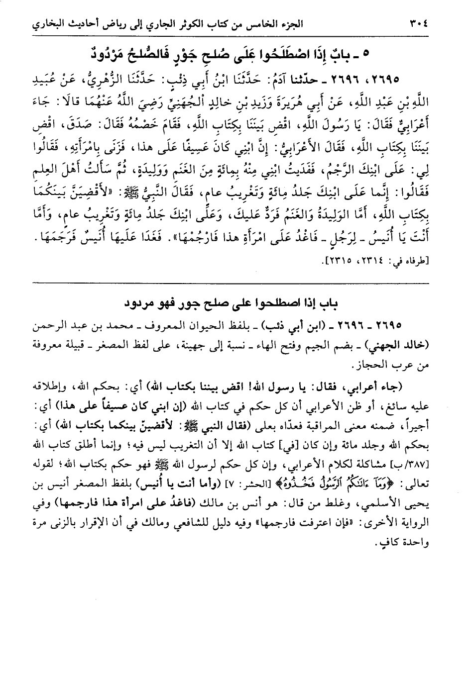 (جاء أعرابي، فقال: يا رسول الله! اقض بيننا بكتاب الله) أي: بحكم الله، وإطلاقه عليه سائغ، أو ظن الأعرابي أن كل حكم في كتاب الله (إن ابني كان عسيفًا على هذا) أي: أجيرًا، ضمنه معنى المراقبة فعدّاه بعلى (فقال النبي - صلى الله عليه وسلم -: لأقضينّ بينكما بكتاب الله) أي: بحكم الله وجلد مائة وإن كان [في] كتاب الله إلا أن التغريب ليس فيه؛ وإنما أطلق كتاب الله مشاكلة لكلام الأعرابي، وإن كل حكم لرسول - صلى الله عليه وسلم - فهو حكم بكتاب الله؛ لقوله تعالى: {وَمَا آتَاكُمُ الرَّسُولُ فَخُذُوهُ} [الحشر: 7] (وأما أنت يا أُنيس) بلفظ المصغر أنيس بن يحيى الأسلمي، وغلط من قال: هو أنس بن مالك (فاغدُ على امرأة هذا فارجمها) وفي الرواية الأخرى: "فإن اعترفت فارجمها" وفيه دليل للشافعي ومالك في أن الإقرار بالزنى مرة واحدة كافٍ.
