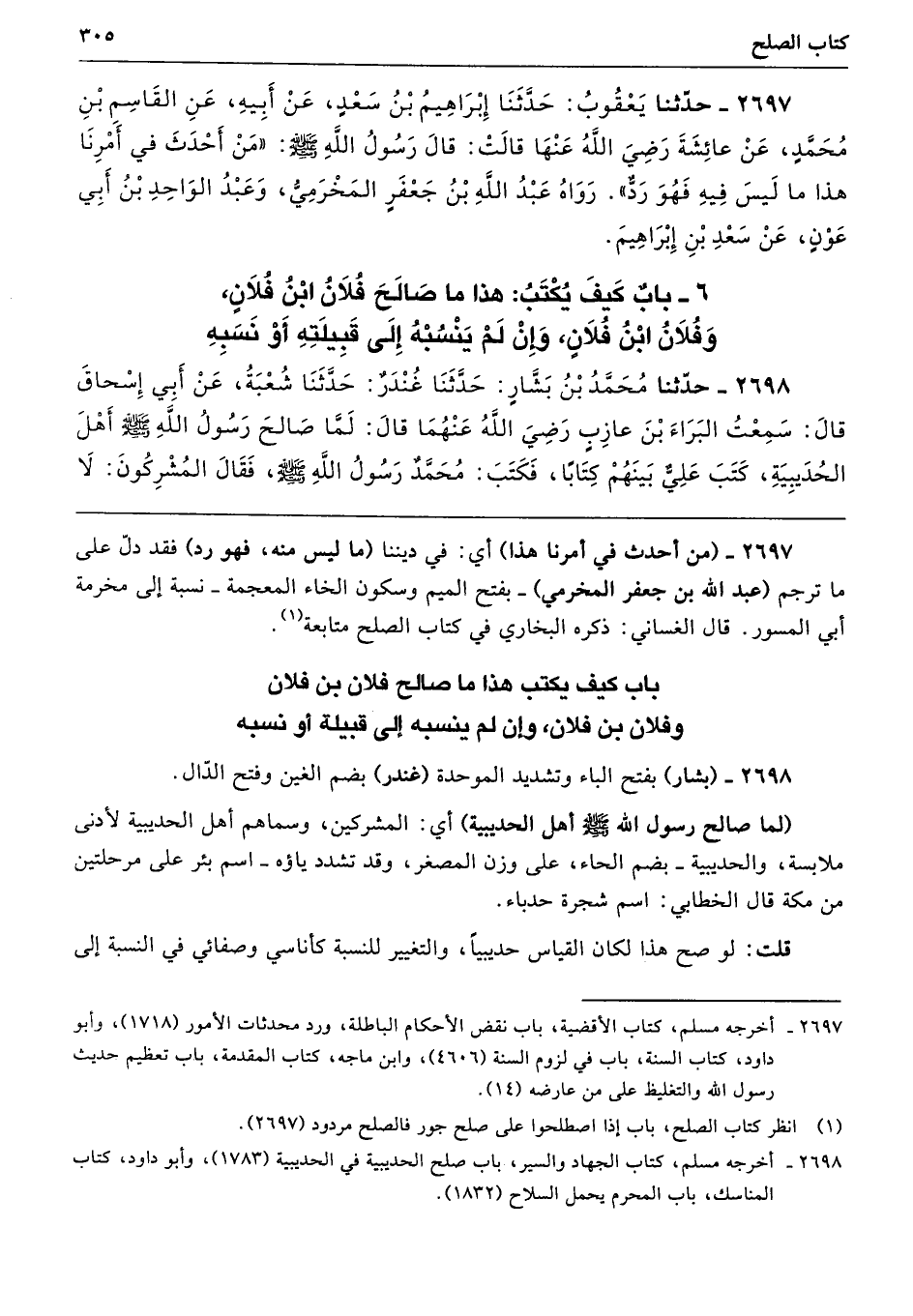 2697 - (من أحدث في أمرنا هذا) أي: في ديننا (ما ليس منه، فهو رد) فقد دلّ على ما ترجم (عبد الله بن جعفر المخرمي) -بفتح الميم وسكون الخاء المعجمة- نسبة إلى مخرمة أبي المسور. قال الغساني: ذكره البخاري في كتاب الصلح متابعة.