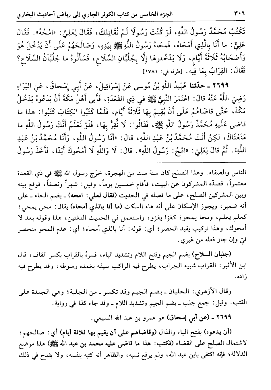 2699 - حَدَّثَنَا عُبَيْدُ اللَّهِ بْنُ مُوسَى عَنْ إِسْرَائِيلَ عَنْ أَبِى إِسْحَاقَ عَنِ الْبَرَاءِ - رضى الله عنه - قَالَ اعْتَمَرَ النَّبِىُّ - صلى الله عليه وسلم - فِي ذِى الْقَعْدَةِ، فَأَبَى أَهْلُ مَكَّةَ أَنْ يَدَعُوهُ يَدْخُلُ مَكَّةَ، حَتَّى قَاضَاهُمْ عَلَى أَنْ يُقِيمَ بِهَا ثَلاَثَةَ أَيَّامٍ، فَلَمَّا كَتَبُوا الْكِتَابَ كَتَبُوا هَذَا مَا قَاضَى عَلَيْهِ مُحَمَّدٌ رَسُولُ اللَّهِ - صلى الله عليه وسلم -. فَقَالُوا لاَ نُقِرُّ بِهَا، فَلَوْ نَعْلَمُ أَنَّكَ رَسُولُ اللَّهِ مَا مَنَعْنَاكَ، لَكِنْ أَنْتَ مُحَمَّدُ بْنُ عَبْدِ اللَّهِ. قَالَ «أَنَا رَسُولُ اللَّهِ وَأَنَا مُحَمَّدُ بْنُ عَبْدِ اللَّهِ». ثُمَّ قَالَ لِعَلِىٍّ «امْحُ رَسُولُ اللَّهِ». قَالَ لاَ، وَاللَّهِ لاَ أَمْحُوكَ أَبَدًا، فَأَخَذَ رَسُولُ