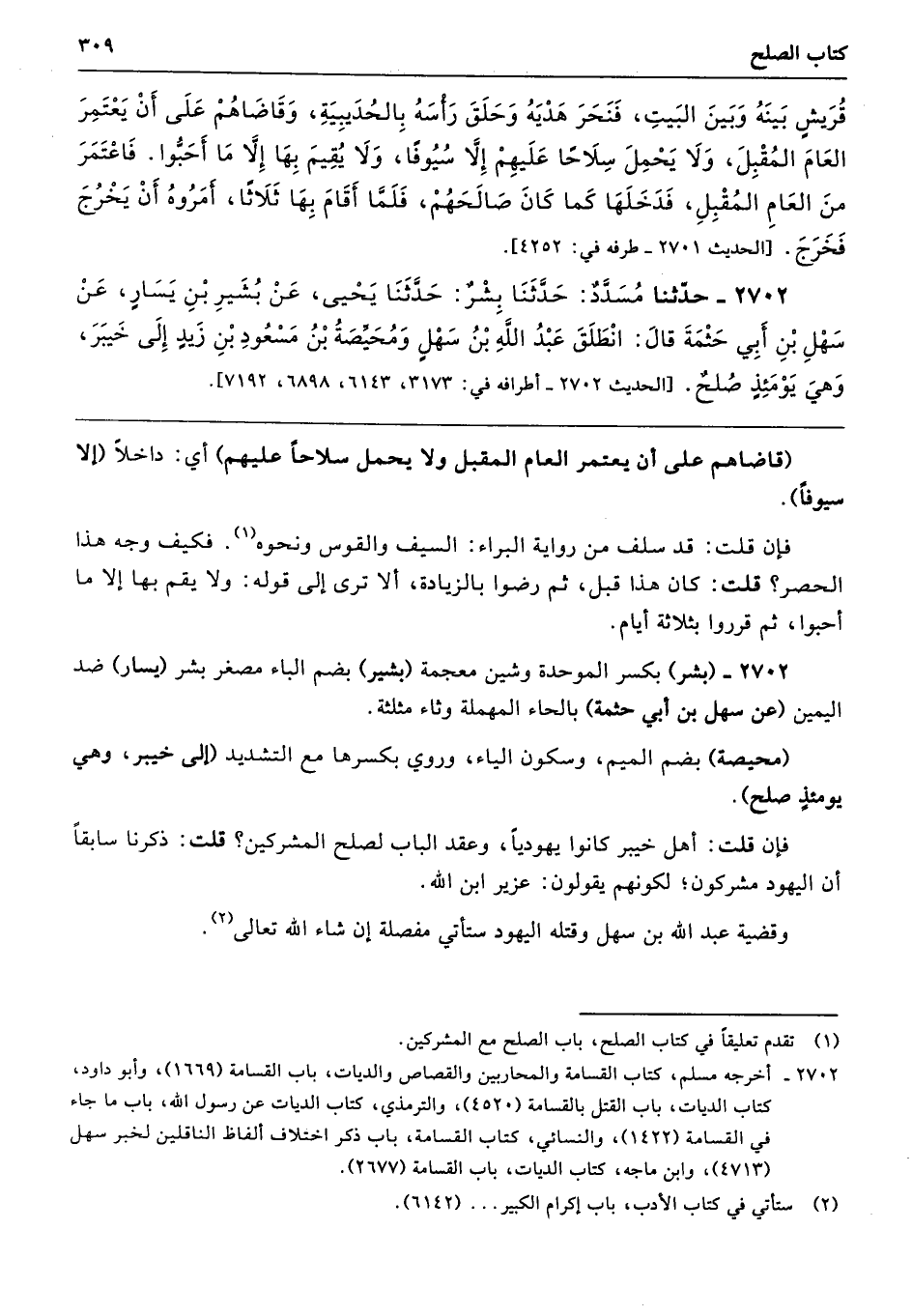 2702 - (بشر) بكسر الموحدة وشين معجمة (بشير) بضم الباء مصغر بشر (يسار) ضد اليمين (عن سهل بن أبي حثمة) بالحاء المهملة وثاء مثلثة.
