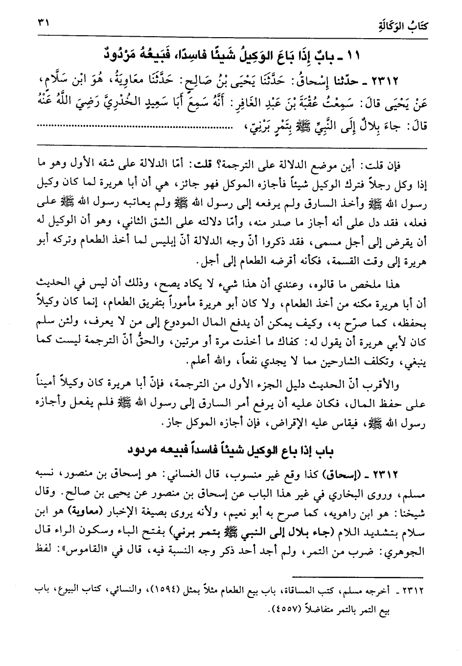 2312 - (إسحاق) كذا وقع غير منسوب، قال الغساني: هو إسحاق بن منصور، نسبه مسلم، وروى البُخَارِيّ في غير هذا الباب عن إسحاق بن منصور عن يحيى بن صالح. وقال شيخنا: هو ابن راهويه، كما صرح به أبو نعيم، ولأنه يروي بصيغة الإخبار (معاوية) هو ابن سلام بتشديد اللام (جاء بلال إلى النَّبِيّ -صلى الله عليه وسلم- بتمر برني) بفتح الباء وسكون الراء قال الجوهري: ضرب من التمر، ولم أجد أحد ذكر وجه النسبة فيه، قال في "القاموس": لفظ