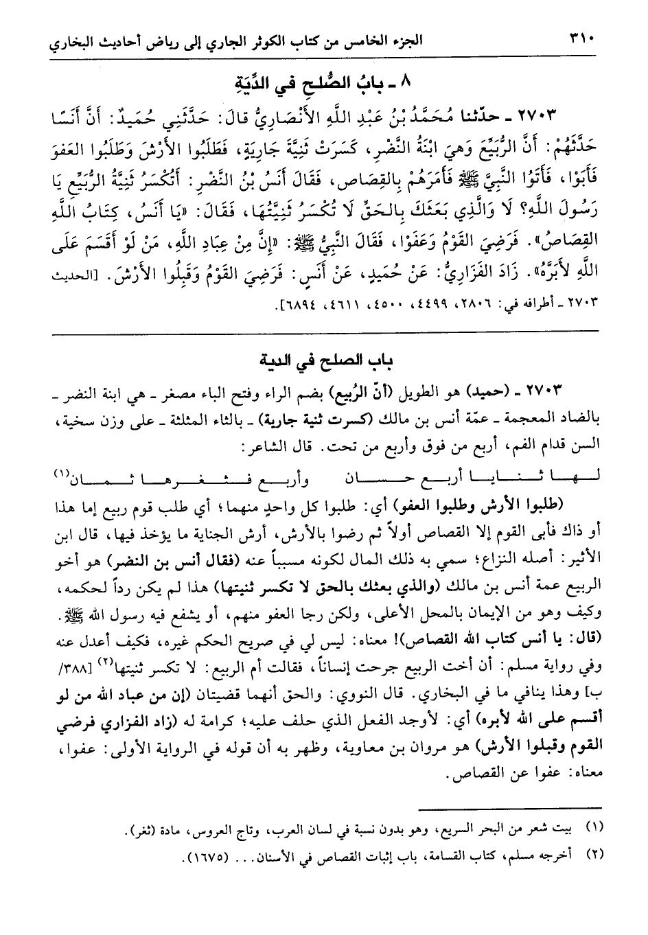 2703 - (حميد) هو الطويل (أنّ الرُبيع) بضم الراء وفتح الباء مصغر -هي ابنة النضر- بالضاد المعجمة- عمّة أنس بن مالك (كسرت ثنية جارية) -بالثاء المثلثة- على وزن سخية، السن قدام الفم، أربع من فوق وأربع من تحت. قال الشاعر: