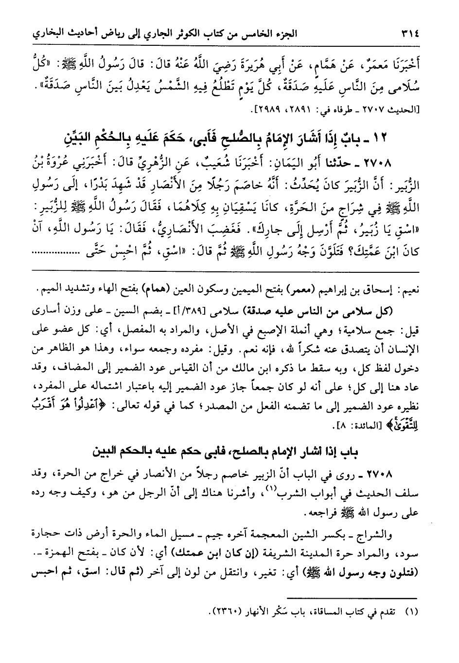 2708 - روى في الباب أن الزبير خاصم رجلًا من الأنصار في خراج من الحرة، وقد سلف الحديث في أبواب الشرب، وأشرنا هناك إلى أن الرجل من هو، وكيف وجه رده على رسول الله - صلى الله عليه وسلم - فراجعه.