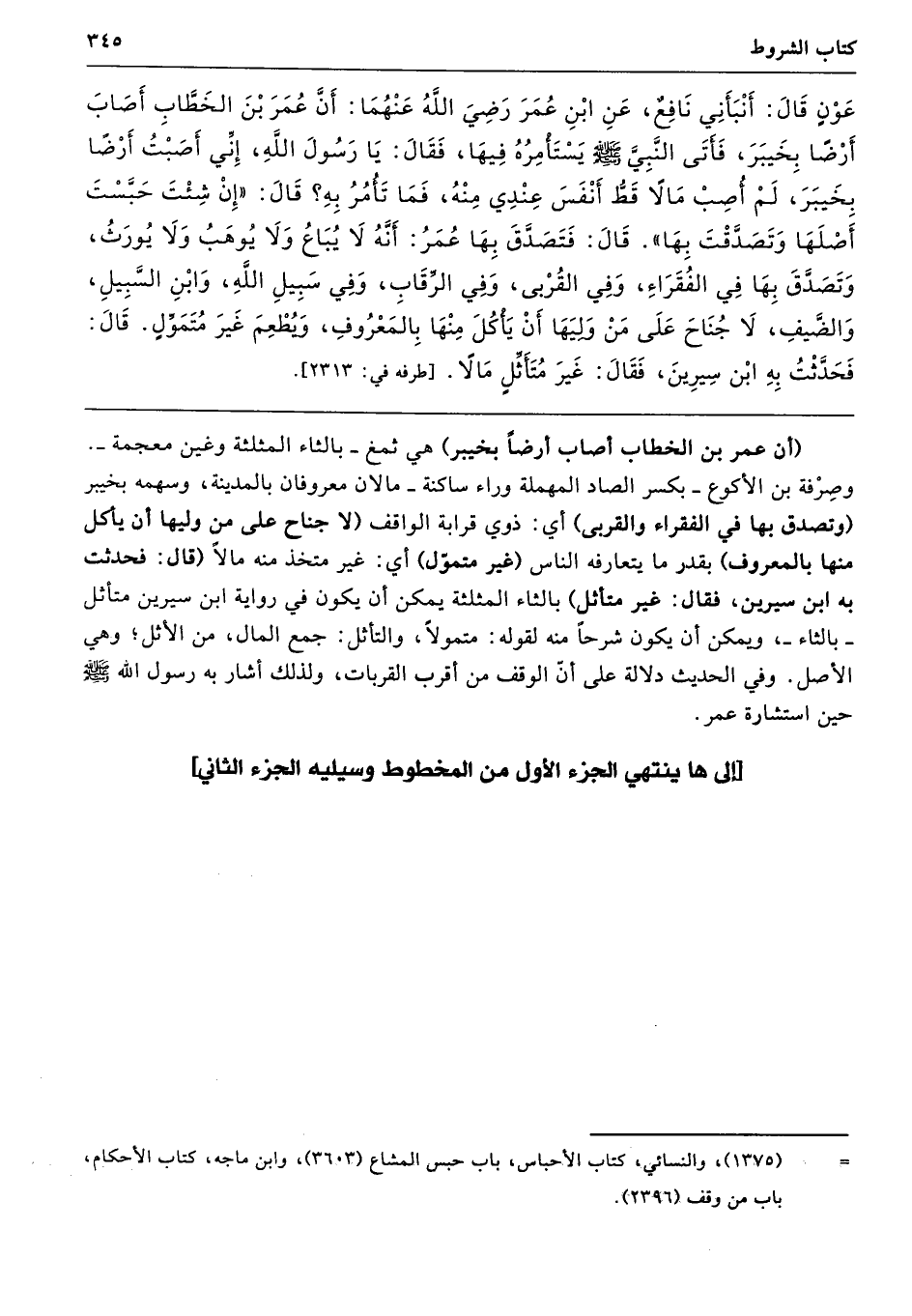 عَوْنٍ قَالَ أَنْبَأَنِى نَافِعٌ عَنِ ابْنِ عُمَرَ - رضى الله عنهما - أَنَّ عُمَرَ بْنَ الْخَطَّابِ أَصَابَ أَرْضًا بِخَيْبَرَ، فَأَتَى النَّبِىَّ - صلى الله عليه وسلم - يَسْتَأْمِرُهُ فِيهَا، فَقَالَ يَا رَسُولَ اللَّهِ، إِنِّى أَصَبْتُ أَرْضًا بِخَيْبَرَ، لَمْ أُصِبْ مَالاً قَطُّ أَنْفَسَ عِنْدِى مِنْهُ، فَمَا تَأْمُرُ بِهِ قَالَ «إِنْ شِئْتَ حَبَسْتَ أَصْلَهَا، وَتَصَدَّقْتَ بِهَا». قَالَ فَتَصَدَّقَ بِهَا عُمَرُ أَنَّهُ لاَ يُبَاعُ وَلاَ يُوهَبُ وَلاَ يُورَثُ، وَتَصَدَّقَ بِهَا فِي الْفُقَرَاءِ وَفِى الْقُرْبَى، وَفِى الرِّقَابِ، وَفِى سَبِيلِ اللَّهِ، وَابْنِ السَّبِيلِ، وَالضَّيْفِ، لاَ جُنَاحَ عَلَى مَنْ وَلِيَهَا أَنْ يَأْكُلَ مِنْهَا بِالْمَعْرُوفِ، وَيُطْعِمَ غَيْرَ مُتَمَوِّلٍ. قَالَ فَحَدَّثْتُ بِهِ ابْنَ سِيرِينَ فَقَالَ غَيْرَ مُتَأَثِّلٍ مَالاً. طرفه 2313