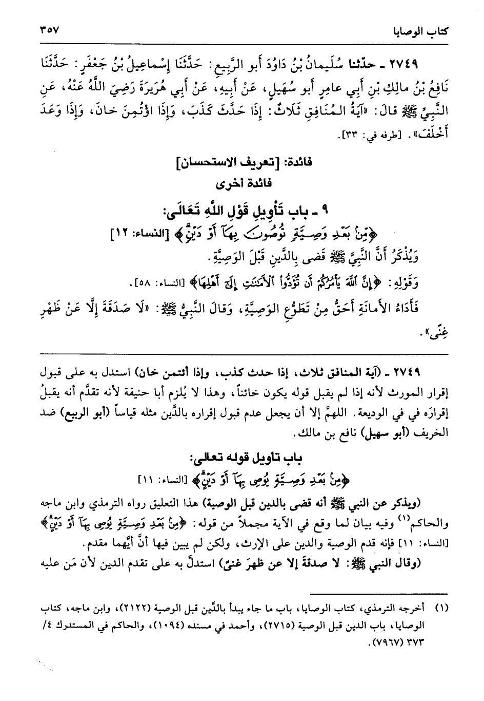 9 - باب تَأْوِيلِ قَوْلِ اللَّهِ تَعَالَى (مِنْ بَعْدِ وَصِيَّةٍ يُوصِى بِهَا أَوْ دَيْنٍ). (9) وَيُذْكَرُ أَنَّ النَّبِىَّ - صلى الله عليه وسلم - قَضَى بِالدَّيْنِ قَبْلَ الْوَصِيَّةِ. وَقَوْلِهِ (إِنَّ اللَّهَ يَأْمُرُكُمْ أَنْ تُؤَدُّوا الأَمَانَاتِ إِلَى أَهْلِهَا)، فَأَدَاءُ الأَمَانَةِ أَحَقُّ مِنْ تَطَوُّعِ الْوَصِيَّةِ. وَقَالَ النَّبِىُّ - صلى الله عليه وسلم - «لاَ صَدَقَةَ إِلاَّ عَنْ ظَهْرِ غِنًى».
