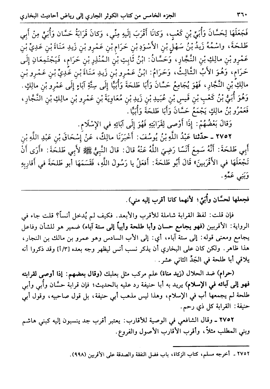 فإن قلت: لفظ القرابة شاملة للأقرب والأبعد. فكيف لم يُدخل أنسًا؛ قلت جاء في الرواية: الأقربين (فهو يجامع حسان وأبا طلحة وأبيًّا إلى ستة آباء) ضمير هو للشأن وفاعل يجامع ومعنى قوله: إلى ستة آباء، أي: إلى الأب السادس وهو عمرو بن مالك بن النجار، هذا ظاهر. ولكن كان على البخاري أن يذكر نسب أنس ليظهر وجه بعده وقد ذكروا أنه يلاقي أبا طلحة في الجَدِّ لثاني عشر.