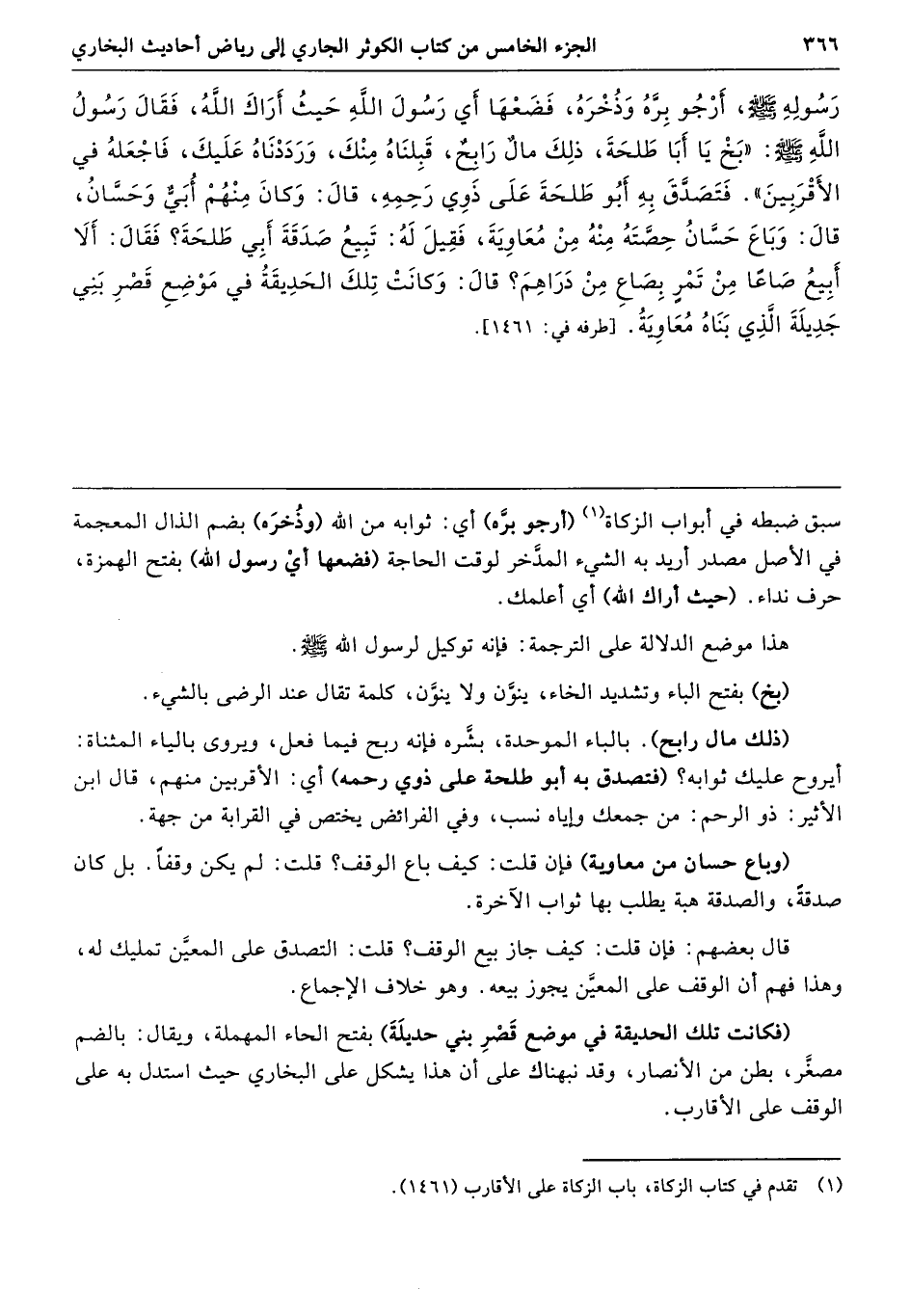 رَسُولِهِ - صلى الله عليه وسلم - أَرْجُو بِرَّهُ وَذُخْرَهُ، فَضَعْهَا أَىْ رَسُولَ اللَّهِ حَيْثُ أَرَاكَ اللَّهُ. فَقَالَ رَسُولُ اللَّهِ - صلى الله عليه وسلم - «بَخْ يَا أَبَا طَلْحَةَ، ذَلِكَ مَالٌ رَابِحٌ، قَبِلْنَاهُ مِنْكَ وَرَدَدْنَاهُ عَلَيْكَ، فَاجْعَلْهُ فِي الأَقْرَبِينَ». فَتَصَدَّقَ بِهِ أَبُو طَلْحَةَ عَلَى ذَوِى رَحِمِهِ، قَالَ وَكَانَ مِنْهُمْ أُبَىٌّ وَحَسَّانُ، قَالَ وَبَاعَ حَسَّانُ حِصَّتَهُ مِنْهُ مِنْ مُعَاوِيَةَ، فَقِيلَ لَهُ تَبِيعُ صَدَقَةَ أَبِى طَلْحَةَ فَقَالَ أَلاَ أَبِيعُ صَاعًا مِنْ تَمْرٍ بِصَاعٍ مِنْ دَرَاهِمَ قَالَ وَكَانَتْ تِلْكَ الْحَدِيقَةُ فِي مَوْضِعِ قَصْرِ بَنِى حُدَيْلَةَ الَّذِى بَنَاهُ مُعَاوِيَةُ. طرفه 1461