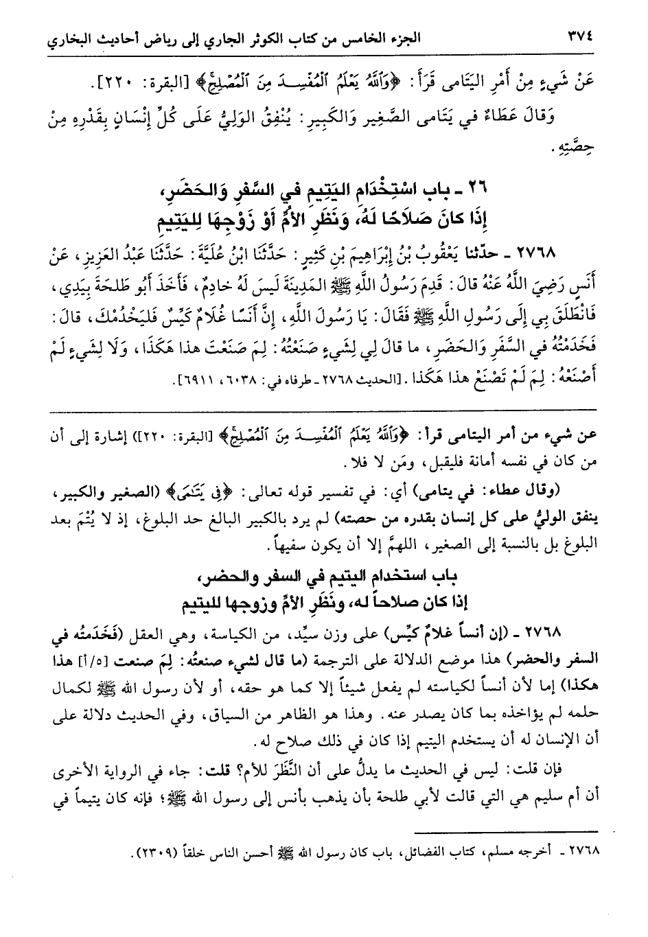 2768 - (إن أنسًا غلامٌ كيِّس) على وزن سيِّد، من الكياسة، وهي العقل (فَخَدَمتُه في السفر والحضر) هذا موضع الدلالة على الترجمة (ما قال لشيء صنعتُه: لِمَ صنعت هذا هكذا) إما لأن أنسًا لكياسته لم يفعل شيئًا إلا كما هو حقه، أو لأن رسول الله - صلى الله عليه وسلم - لكمال حلمه لم يؤاخذه بما كان يصدر عنه. وهذا هو الظاهر من السياق، وفي الحديث دلالة على أن الإنسان له أن يستخدم اليتيم إذا كان في ذلك صلاح له.
