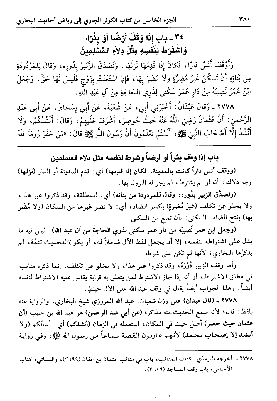 2778 - (قال عبدان) على وزن شعبان: عبد الله المروزي شيخ البخاري، والرواية عنه بلفظ: قال؛ لأنه سمع الحديث منه مذاكرة (عن أبي عبد الرحمن) هو عبد الله بن حبيب (أن عثمان حيث حصر) أصل حيث في المكان، استعمله في الزمان (أنشدكم) أي: أسألكم (ولا أنشد إلا إصحاب محمد) لأنهم عارفون القصة سماعًا من رسول الله - صلى الله عليه وسلم -، وفي رواية