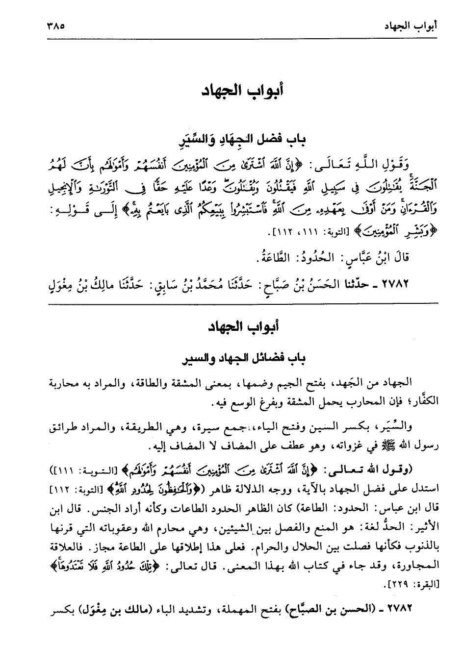 (وقول الله تعالى: {إِنَّ اللَّهَ اشْتَرَى مِنَ الْمُؤْمِنِينَ أَنْفُسَهُمْ وَأَمْوَالَهُمْ} [التوبة: 111] استدل على فضل الجهاد بالآية ووجه الدلالة ظاهر ({وَالْحَافِظُونَ لِحُدُودِ اللَّهِ} [التوبة:112] قال ابن عباس: الحدود: الطاعة) كان الظاهر الحدود الطاعات وكأنه أراد الجنس. قال ابن الأثير: الحدُّ لغة: هو المنع والفصل بين الشيئين، وهي محارم الله وعقوباته التي قرنها بالذنوب فكأنها فصلت بين الحلال والحرام. فعلى هذا إطلاقها على الطاعة مجاز. فالعلاقة المجاورة، وقد جاء في كتاب الله بهذا المعنى. قال تعالى: {تِلْكَ حُدُودُ اللَّهِ فَلَا تَعْتَدُوهَا} [البقرة: 229].
