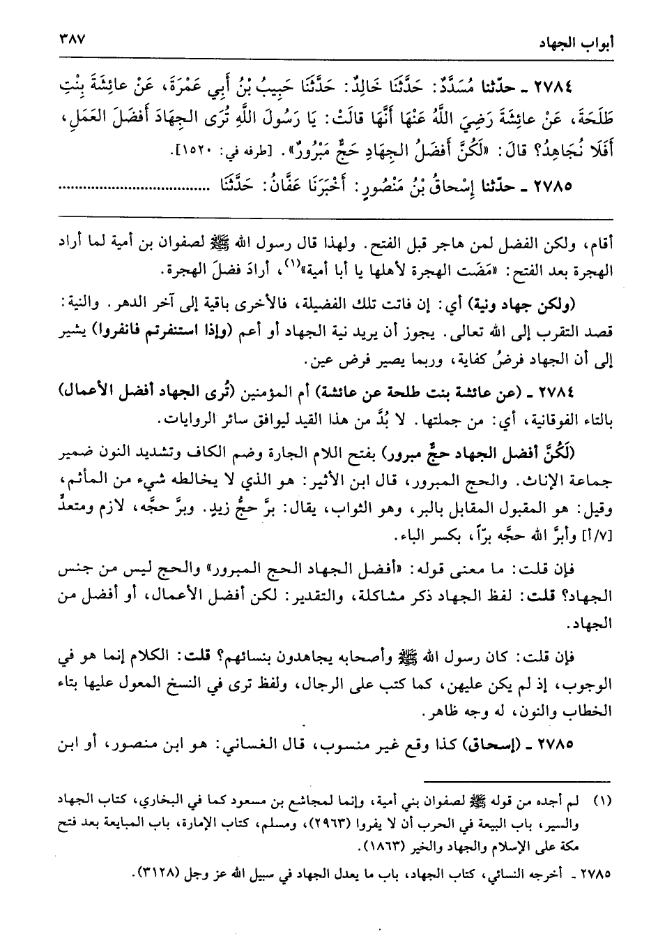 2784 - (عن عائشة بنت طلحة عن عائشة) أم المؤمنين (تُرى الجهاد أفضل الأعمال) بالتاء الفوقانية، أي: من جملتها. لا بُدَّ من هذا القيد ليوافق سائر الروايات.