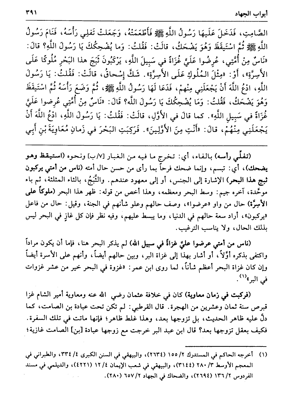 (تفلِّي رأسه) بالفاء، أي: تخرج ما فيه من الغبار ونحوه (استيقظ وهو يضحك)، أي: تبسم، وإنما ضحك فرحًا بما رأى من حسن حال أمته (ناس من أمتي يركبون ثبج هذا البحر) الإشارة إلى الجنس، أو إلى معهود عندهم. والثَّبَجُ، بالثاء المثلثة، ثم باء موحَّدة، آخره جيم: وسط البحر ومعظمه، وهذا أخص من قوله: ظهر هذا البحر (ملوكًا على الأسِرَّة) حال من واو "عرضوا"، وصف حالهم وعلو شأنهم في الجنة، وقيل: حال من فاعل "يركبون"، أراد سعة حالهم في الدنيا، وما يبسط عليهم، وفيه نظر فإن كل غازٍ في البحر ليس بذلك الحال، ولا يناسب الترغيب.