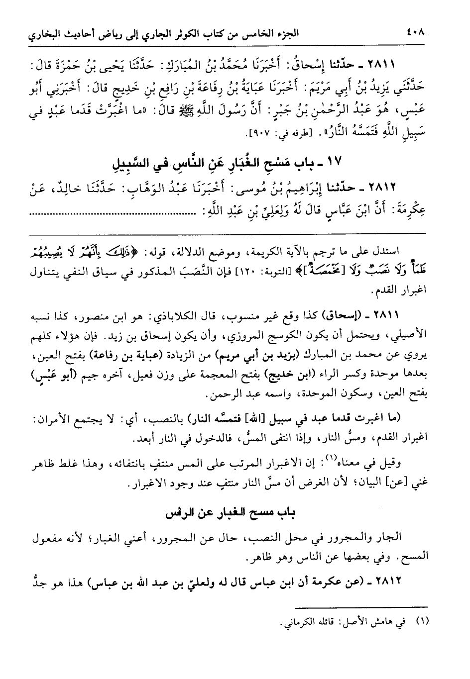 2811 - (إسحاق) كذا وقع غير منسوب، قال الكلاباذي: هو ابن منصور، كذا نسبه الأصيلي، ويحتمل أن يكون الكوسج المروزي، وأن يكون إسحاق بن زيد. فإن هؤلاء كلهم يروي عن محمد بن المبارك (يزيد بن أبي مريم) من الزيادة (عباية بن رفاعة) بفتح العين، بعدها موحدة وكسر الراء (ابن خديج) بفتح المعجمة على وزن فعيل، آخره جيم (أبو عَبْسٍ) بفتح العين، وسكون الموحدة، واسمه عبد الرحمن.