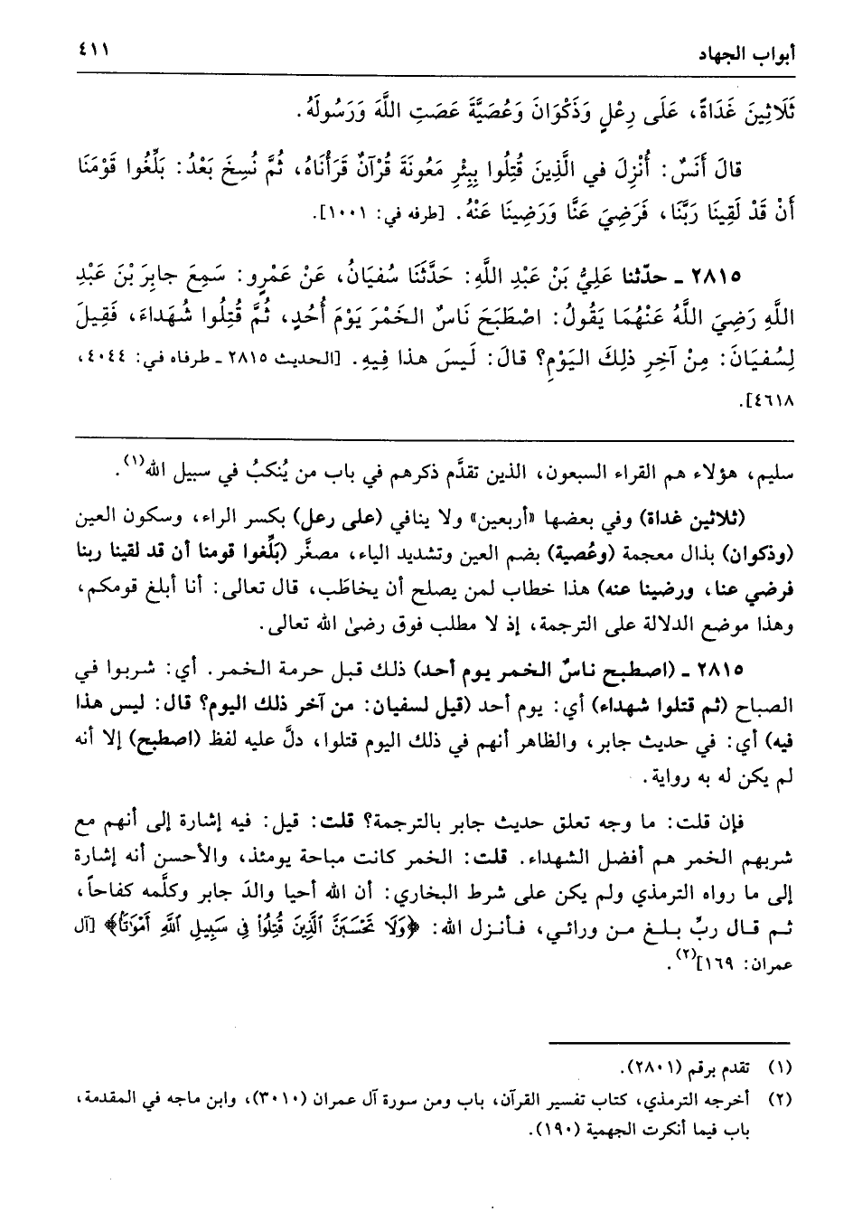 2815 - (اصطبح ناسٌ الخمر يوم أحد) ذلك قبل حرمة الخمر. أي: شربوا في الصباح (ثم قتلوا شهداء) أي: يوم أحد (قيل لسفيان: من آخر ذلك اليوم؟ قال: ليس هذا فيه) أي: في حديث جابر، والظاهر أنهم في ذلك اليوم قتلوا، دلَّ عليه لفظ (اصطبح) إلا أنَّه لم يكن له به رواية.