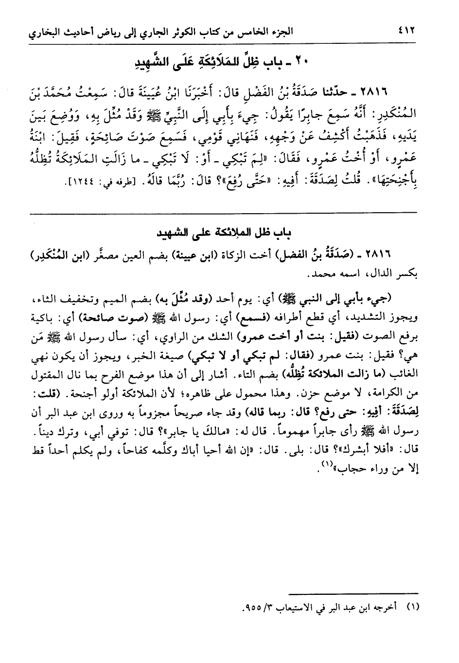 (جيء بأبي إلى النبي - صلى الله عليه وسلم -) أي: يوم أحد (وقد مُثِّلَ به) بضم الميم وتخفيف الثاء، ويجوز التشديد، أي قطع أطرافه (فسمع) أي: رسول الله - صلى الله عليه وسلم - (صوت صائحة) أي: باكية برفع الصوت (فقيل: بنت أو أخت عمرو) الشك من الراوي، أي: سأل رسول الله - صلى الله عليه وسلم - مَن هي؟ فقيل: بنت عمرو (فقال: لم تبكي أو لا تبكي) صيغة الخبر، ويجوز أن يكون نهي الغائب (ما زالت الملائكة تُظِلُّه) بضم التاء. أشار إلى أن هذا موضع الفرح بما نال المقتول من الكرامة، لا موضع حزن. وهذا محمول على ظاهره؛ لأن الملائكة أولو أجنحة. (قلت: لِصَدَقَةَ: أفِيهِ: حتَّى رفع؟ قال: ربما قاله) وقد جاء صريحًا مجزومًا به وروى ابن عبد البر أن رسول الله - صلى الله عليه وسلم - رأى جابرًا مهمومًا. قال له: "ما لكَ يا جابر"؟ قال: توفي أبي، وترك دينًا. قال: "أفلا أبشركُ"؟ قال: بلى. قال: "إن الله أحيا أباك وكلَّمه كفاحًا، ولم يكلم أحدًا قط إلا من وراء حجاب".