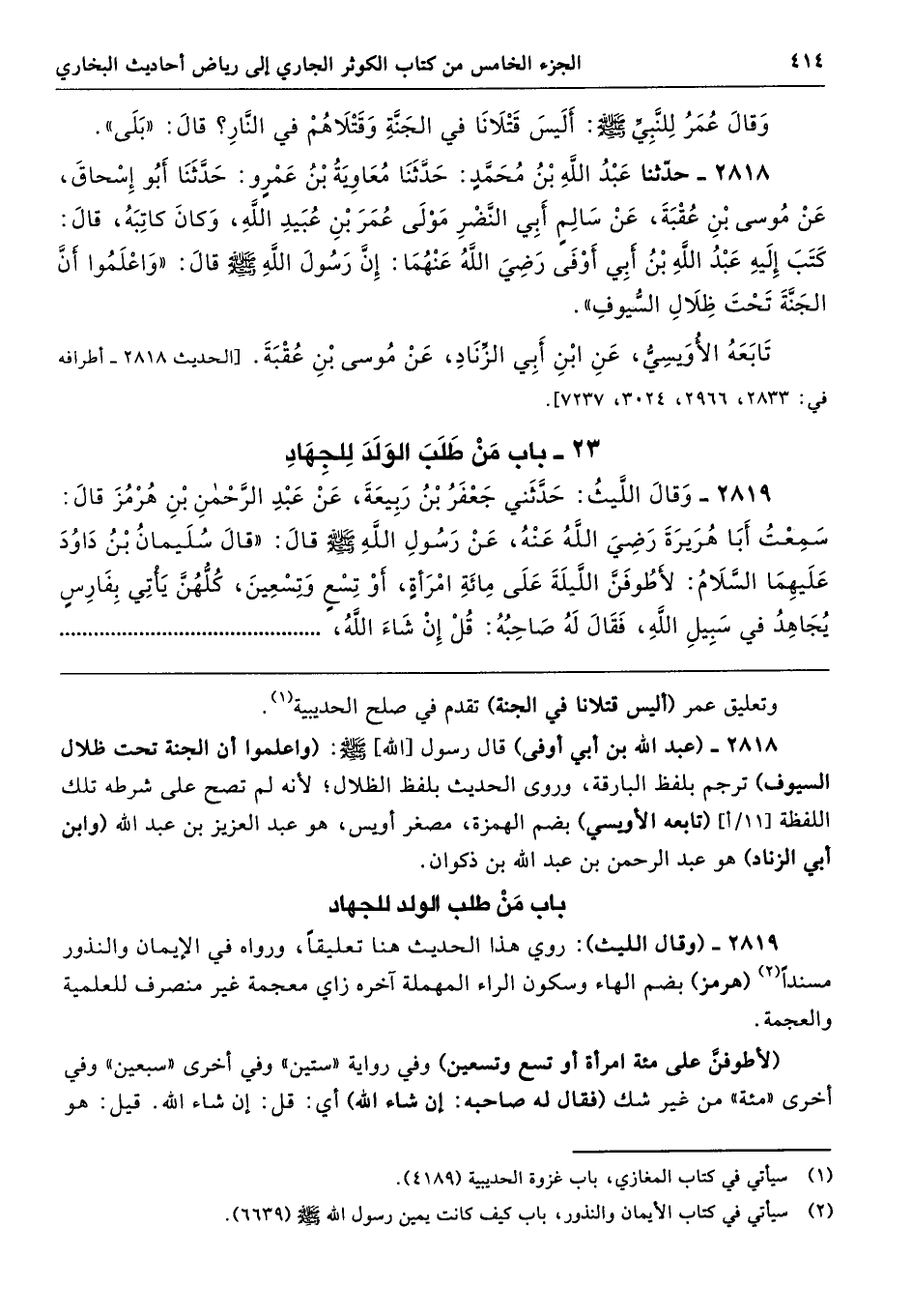 2818 - (عبد الله بن أبي أوفى) قال رسول [الله]- صلى الله عليه وسلم -: (واعلموا أن الجنّة تحت ظلال السيوف) ترجم بلفظ البارقة، وروى الحديث بلفظ الظلال؛ بيانه لم تصح على شرطه تلك اللفظة (تابعه الأويسي) بضم الهمزة، مصغر أويس، هو عبد العزيز بن عبد الله (وابن أبي الزناد) هو عبد الرحمن بن عبد الله بن ذكوان.