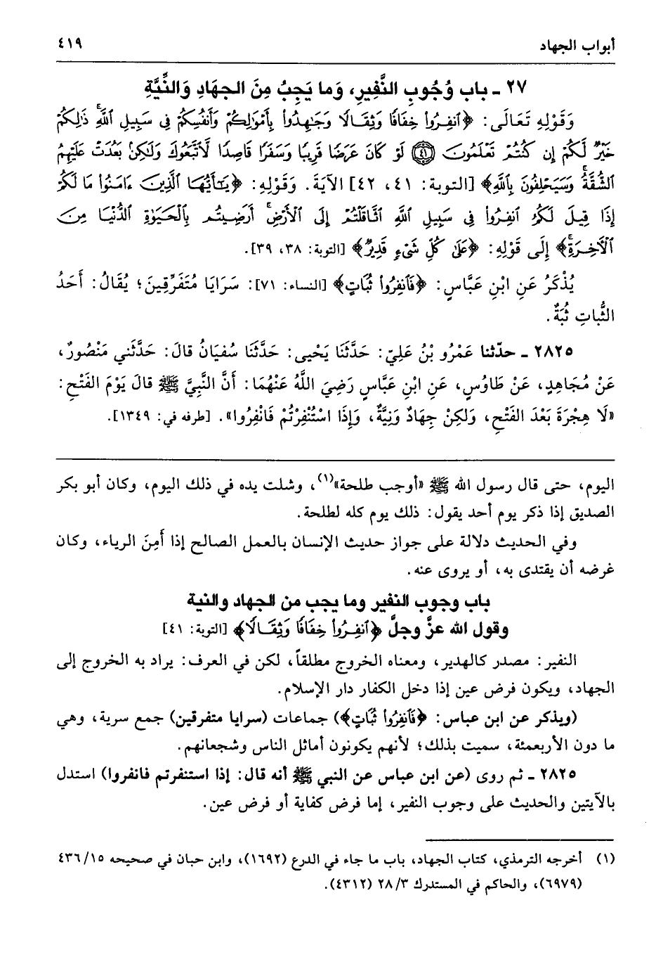2825 - ثم روى (عن ابن عباس عن النبي - صلى الله عليه وسلم - أنَّه قال: إذا استنفرتم فانفروا) استدل بالآيتين والحديث على وجوب النفير، إما فرض كفاية أو فرض عين.