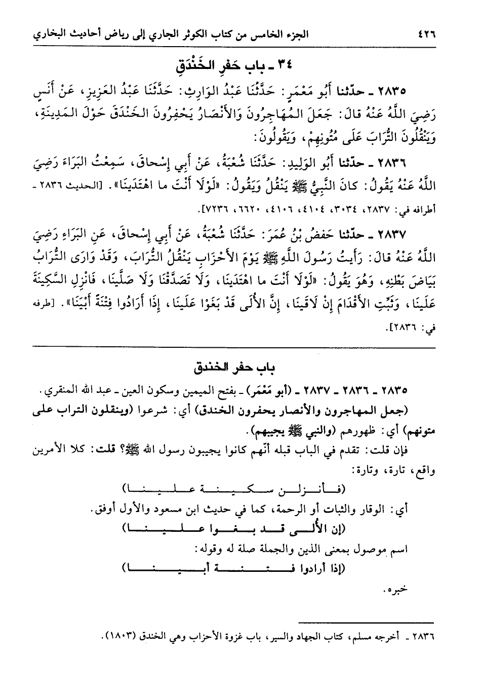 2836 - حَدَّثَنَا أَبُو الْوَلِيدِ حَدَّثَنَا شُعْبَةُ عَنْ أَبِى إِسْحَاقَ سَمِعْتُ الْبَرَاءَ - رضى الله عنه - كَانَ النَّبِىُّ - صلى الله عليه وسلم - يَنْقُلُ وَيَقُولُ «لَوْلاَ أَنْتَ مَا اهْتَدَيْنَا». أطرافه 2837، 3034، 4104، 4106، 6620، 7236