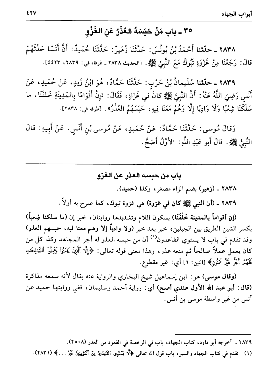 2839 - حَدَّثَنَا سُلَيْمَانُ بْنُ حَرْبٍ حَدَّثَنَا حَمَّادٌ - هُوَ ابْنُ زَيْدٍ - عَنْ حُمَيْدٍ عَنْ أَنَسٍ - رضى الله عنه - أَنَّ النَّبِىَّ - صلى الله عليه وسلم - كَانَ فِي غَزَاةٍ فَقَالَ «إِنَّ أَقْوَامًا بِالْمَدِينَةِ خَلْفَنَا، مَا سَلَكْنَا شِعْبًا وَلاَ وَادِيًا إِلاَّ وَهُمْ مَعَنَا فِيهِ، حَبَسَهُمُ الْعُذْرُ». طرفاه 2838