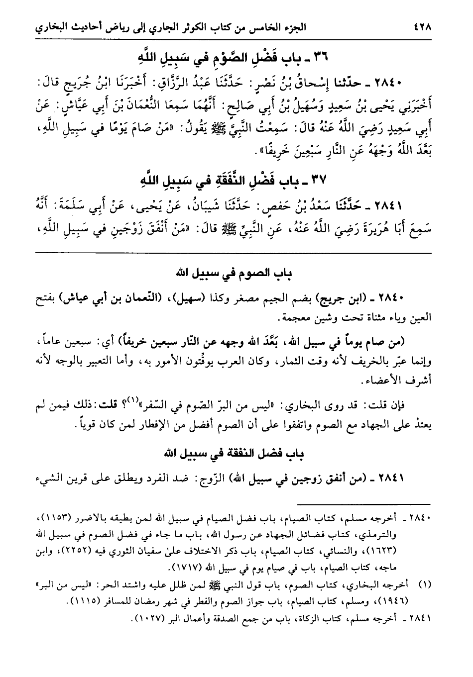 2841 - حَدَّثَنَا سَعْدُ بْنُ حَفْصٍ حَدَّثَنَا شَيْبَانُ عَنْ يَحْيَى عَنْ أَبِى سَلَمَةَ أَنَّهُ سَمِعَ أَبَا هُرَيْرَةَ - رضى الله عنه - عَنِ النَّبِيِّ - صلى الله عليه وسلم - قَالَ «مَنْ أَنْفَقَ زَوْجَيْنِ فِي سَبِيلِ اللَّهِ