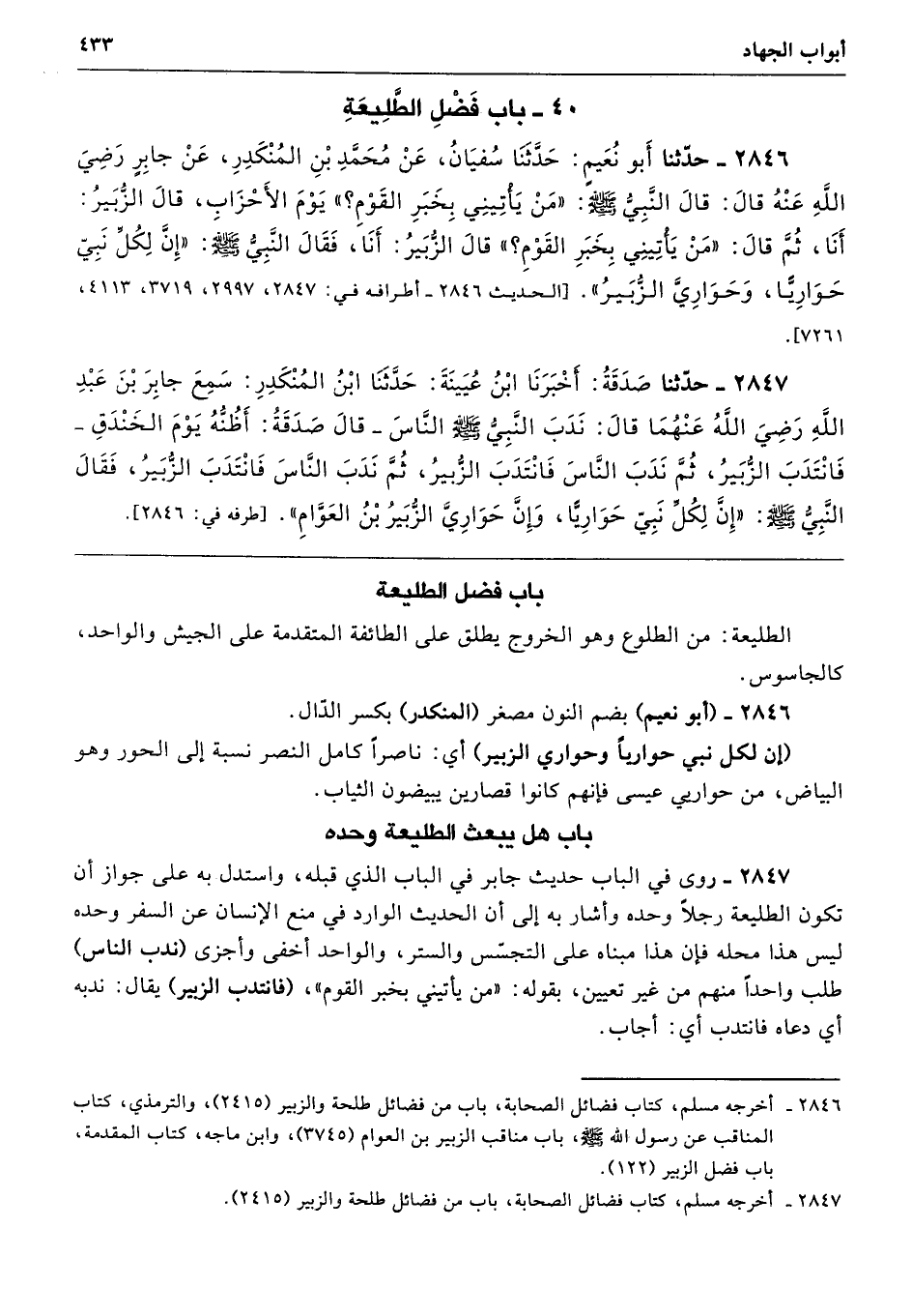 2846 - حَدَّثَنَا أَبُو نُعَيْمٍ حَدَّثَنَا سُفْيَانُ عَنْ مُحَمَّدِ بْنِ الْمُنْكَدِرِ عَنْ جَابِرٍ - رضى الله عنه - قَالَ قَالَ النَّبِىُّ - صلى الله عليه وسلم - «مَنْ يَأْتِينِى بِخَبَرِ الْقَوْمِ يَوْمَ الأَحْزَابِ». قَالَ الزُّبَيْرُ أَنَا. ثُمَّ قَالَ «مَنْ يَأْتِينِى بِخَبَرِ الْقَوْمِ». قَالَ الزُّبَيْرُ أَنَا. فَقَالَ النَّبِىُّ - صلى الله عليه وسلم - «إِنَّ لِكُلِّ نَبِىٍّ حَوَارِيًّا، وَحَوَارِىَّ الزُّبَيْرُ». أطرافه 2847، 2997، 3719، 4113، 7261