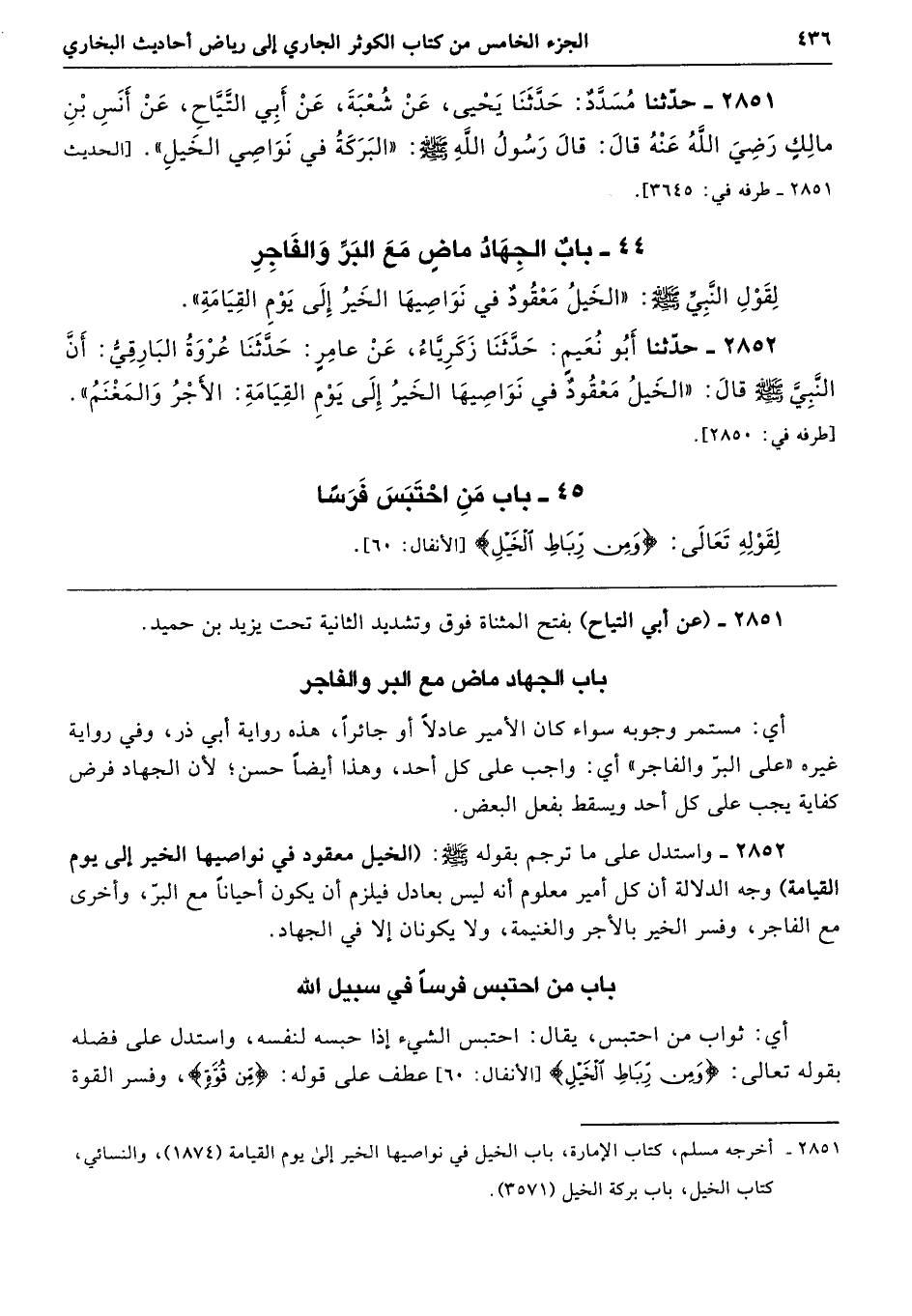 2851 - حَدَّثَنَا مُسَدَّدٌ حَدَّثَنَا يَحْيَى عَنْ شُعْبَةَ عَنْ أَبِى التَّيَّاحِ عَنْ أَنَسِ بْنِ مَالِكٍ - رضى الله عنه - قَالَ قَالَ رَسُولُ اللَّهِ - صلى الله عليه وسلم - «الْبَرَكَةُ فِي نَوَاصِى الْخَيْلِ». طرفه 3645