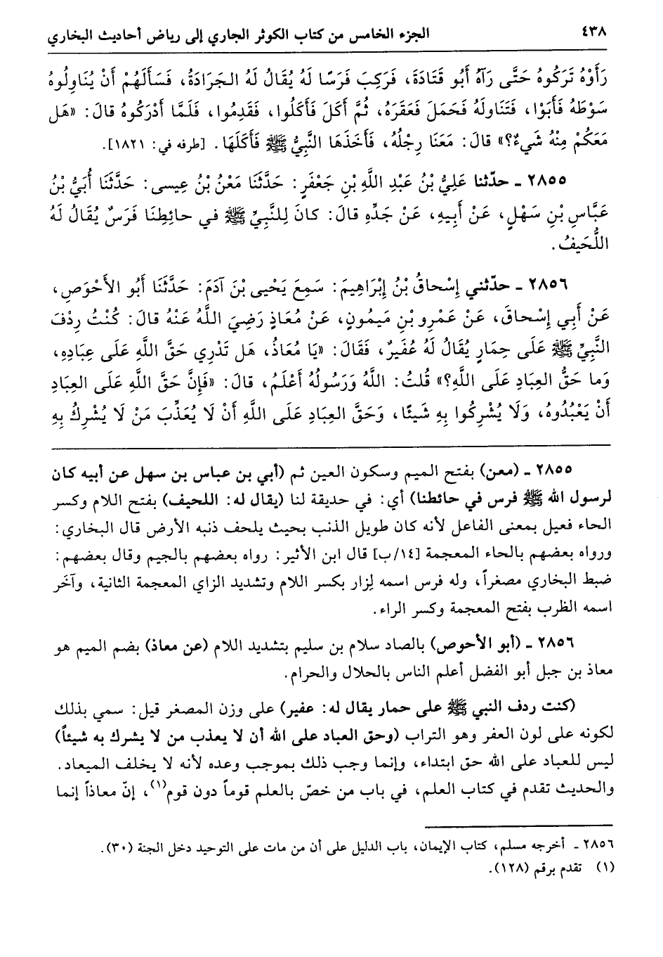2855 - (معن) بفتح الميم وسكون العين ثم (أبي بن عباس بن سهل عن أبيه كان لرسول الله - صلى الله عليه وسلم - فرس في حائطنا) أي: في حديقة لنا (يقال له: اللحيف) بفتح اللام وكسر الحاء فعيل بمعنى الفاعل لأنه كان طويل الذنب بحيث يلحف ذنبه الأرض قال البخاري: ورواه بعضهم بالحاء المعجمة قال ابن الأثير: رواه بعضهم بالجيم وقال بعضهم: ضبط البخاري مصغرًا، وله فرس اسمه لِزار بكسر اللام وتشديد الزاي المعجمة الثانية، وآخَر اسمه الظرب بفتح المعجمة وكسر الراء.