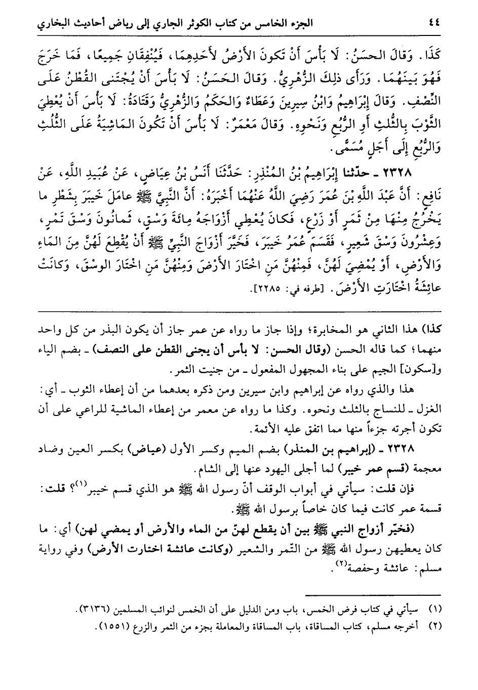 2328 - حَدَّثَنَا إِبْرَاهِيمُ بْنُ الْمُنْذِرِ حَدَّثَنَا أَنَسُ بْنُ عِيَاضٍ عَنْ عُبَيْدِ اللَّهِ عَنْ نَافِعٍ أَنَّ عَبْدَ اللَّهِ بْنَ عُمَرَ - رضى الله عنهما - أَخْبَرَهُ أَنَّ النَّبِىَّ - صلى الله عليه وسلم - عَامَلَ خَيْبَرَ بِشَطْرِ مَا يَخْرُجُ مِنْهَا مِنْ ثَمَرٍ أَوْ زَرْعٍ، فَكَانَ يُعْطِى أَزْوَاجَهُ مِائَةَ وَسْقٍ ثَمَانُونَ وَسْقَ تَمْرٍ وَعِشْرُونَ وَسْقَ شَعِيرٍ، فَقَسَمَ عُمَرُ خَيْبَرَ، فَخَيَّرَ أَزْوَاجَ النَّبِيِّ - صلى الله عليه وسلم - أَنْ يُقْطِعَ لَهُنَّ مِنَ الْمَاءِ وَالأَرْضِ، أَوْ يُمْضِىَ لَهُنَّ، فَمِنْهُنَّ مَنِ اخْتَارَ الأَرْضَ وَمِنْهُنَّ مَنِ اخْتَارَ الْوَسْقَ، وَكَانَتْ عَائِشَةُ اخْتَارَتِ الأَرْضَ. طرفه 2285