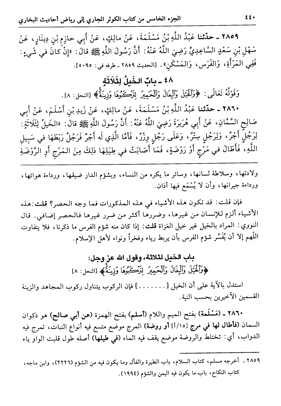 2860 - (مَسْلَمة) بفتح الميم واللام (أسلم) بفتح الهمزة (عن أبي صالح) هو ذكوان السمان (فأطال لها في مرج أو روضة) المرج موضع متسع فيه أنواع النبات، تمرج فيه الدواب، أي: تختلط والروضة موضع يقف فيه الماء (في طيلها) أصله طول قلبت الواو ياء