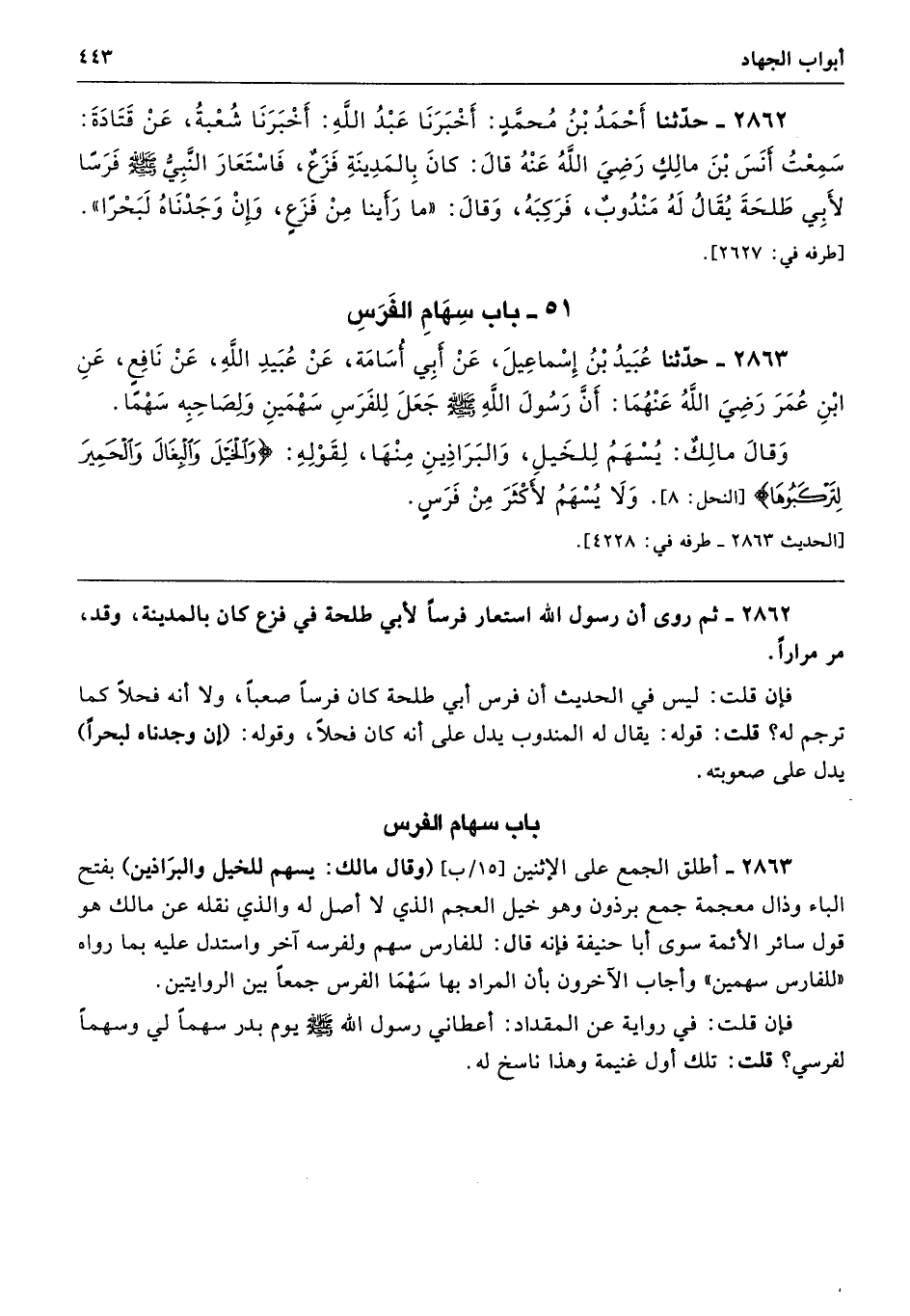 2863 - حَدَّثَنَا عُبَيْدُ بْنُ إِسْمَاعِيلَ عَنْ أَبِى أُسَامَةَ عَنْ عُبَيْدِ اللَّهِ عَنْ نَافِعٍ عَنِ ابْنِ عُمَرَ - رضى الله عنهما أَنَّ رَسُولَ اللَّهِ - صلى الله عليه وسلم - جَعَلَ لِلْفَرَسِ سَهْمَيْنِ وَلِصَاحِبِهِ سَهْمًا. وَقَالَ مَالِكٌ يُسْهَمُ لِلْخَيْلِ وَالْبَرَاذِينِ مِنْهَا لِقَوْلِهِ (وَالْخَيْلَ وَالْبِغَالَ وَالْحَمِيرَ لِتَرْكَبُوهَا) وَلاَ يُسْهَمُ لأَكْثَرَ مِنْ فَرَسٍ. طرفه 4228
