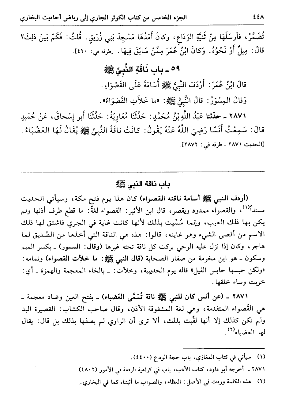 2871 - (عن أنس كان للنبي - صلى الله عليه وسلم - ناقة تُسَمَّى العَضباء) -بفتح العين وضاد معجمة- هي القَصواء المتقدمة، وهي لغة المشقوقة الأذن، وقال صاحب الكثاب: القصيرة اليد ولم تكن كذلك إلا أنها لقِّبت بذلك، ألا ترى أن الراوي لم يصفها بذلك بل قال: يقال لها العضباء.