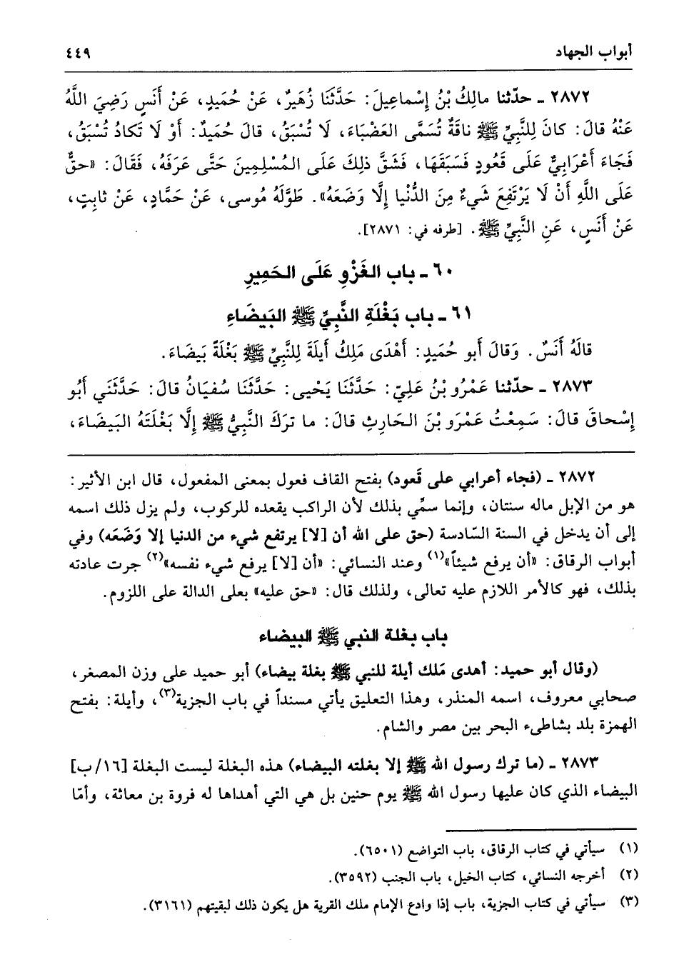 (وقال أبو حميد: أهدى مَلك أيلة للنبي - صلى الله عليه وسلم - بغلة بيضاء) أبو حميد على وزن المصغر، صحابي معروف، اسمه المنذر، وهذا التعليق يأتي مسندًا في باب الجزية، وأيلة: بفتح الهمزة بلد بشاطئ البحر بين مصر والشام.