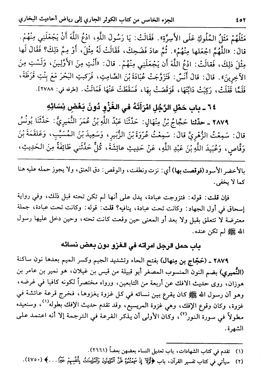 2879 - (حَجّاج بن مِنهال) بفتح الحاء وتشديد الجيم وكسر الميم بعدها نون ساكنة (النُّميري) بضم النون المنسوب المصغر أبو قبيلة من قيس بن غيلان، هو نمير بن عامر بن هوزان، روى حديث الإفك عن أربعة من التابعين، ورواه مختصرًا لكونه كافيا في غرضه، وهو أن رسول الله - صلى الله عليه وسلم - كان يقرع بين نسائه في كل غزوة يغزوها، فخرج قرعة عائشة في غزوة، وكان وقوع الإفك، وهي غزوة المريسيع، وقد تقدم حديث الإفك بطوله، وسنعيده مطولًا في سورة النور، وكان الأولى أن يذكر القرعة في الترجمة إلا أنَّه اعتمد على الشهرة.