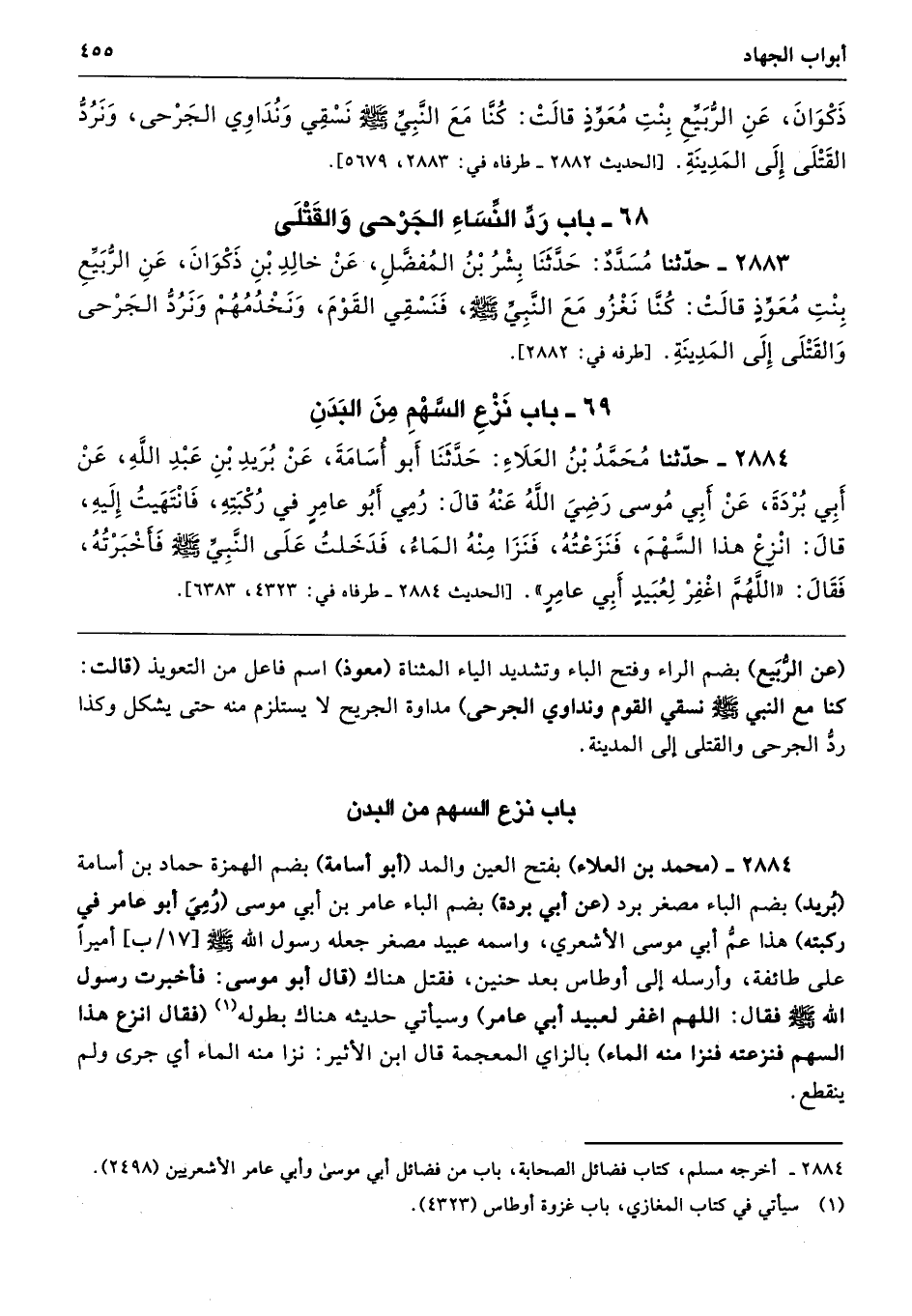 2884 - (محمد بن العلاء) بفتح العين والمد (أبو أسامة) بضم الهمزة حماد بن أسامة (بُريد) بضم الباء مصغر برد (عن أبي بردة) بضم الباء عامر بن أبي موسى (رُمِيَ أبو عامر في ركبته) هذا عمُّ أبي موسى الأشعري، واسمه عبيد مصغر جعله رسول الله - صلى الله عليه وسلم - أميرًا على طائفة، وأرسله إلى أوطاس بعد حنين، فقتل هناك (قال أبو موسى: فأخبرت رسول الله - صلى الله عليه وسلم - فقال: اللهم اغفر لعبيد أبو عامر) وسيأتي حديثه هناك بطوله (فقال انزع هذا السهم فنزعته فنزا منه الماء) بالزاي المعجمة قال ابن الأثير: نزا منه الماء أي جرى ولم ينقطع.