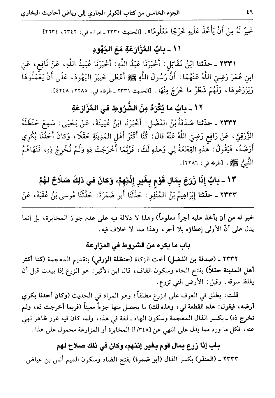 2332 - حَدَّثَنَا صَدَقَةُ بْنُ الْفَضْلِ أَخْبَرَنَا ابْنُ عُيَيْنَةَ عَنْ يَحْيَى سَمِعَ حَنْظَلَةَ الزُّرَقِىَّ عَنْ رَافِعٍ - رضى الله عنه - قَالَ كُنَّا أَكْثَرَ أَهْلِ الْمَدِينَةِ حَقْلاً، وَكَانَ أَحَدُنَا يُكْرِى أَرْضَهُ، فَيَقُولُ هَذِهِ الْقِطْعَةُ لِى وَهَذِهِ لَكَ، فَرُبَّمَا أَخْرَجَتْ ذِهِ وَلَمْ تُخْرِجْ ذِهِ، فَنَهَاهُمُ النَّبِىُّ - صلى الله عليه وسلم -. طرفه 2286