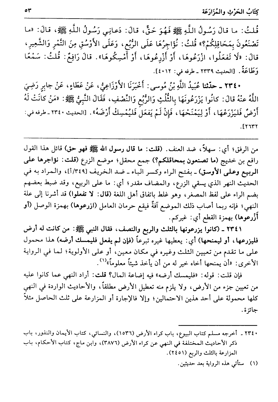 رافع بن خديج (ما تصنعون بمحاقلكم؟) جمع محقل؛ موضع الزرع (قلت: نؤاجرها على الرَّبيع وعلى الأوسق) -بفتح الراء وكسر الباء- ضد الخريف , والمراد به في الحديث النهر الذي يسقي الزرع، والمضاف مقدر؛ أي: ما على الرَّبيع، وقد ضبط بعضهم بضم الراء على لفظ المصغر، وهو غلط باتفاق أهل اللغة (قال: لا تفعلوا) قد أشرنا إلى علة النهي؛ فإنَّه ربما أصاب ذلك الموضع آفةٌ فيقع حرمان العامل (ازرعوها) بهمزة الوصل (أو أَزْرعوها) بهمزة القطع أي: غيركم.