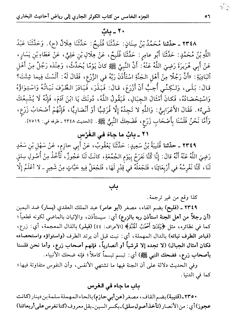 2349 - (فليح) بضم الفاء، مصغر (أبو عامر) عبد الملك العقدي (يسار) ضد اليمين (أن رجلًا من أهل الجنة استأذن ربه بالزرع) أي: سيستأذن، والإتيان بالماضي لكونه قطعيًّا؛ كما في نظائره، مثل {وَنَادَى أَصْحَابُ الْجَنَّةِ} [الأعراف: 44] (فبذر) بالذال المعجمة، أي: زرع، (فبادر الطرف نباته) بالدال المهملة، أي: نبت قبل أن يرتد الطرف (واستواؤه واستحصاده فكان أمثال الجبال) (لا تجده إلَّا قرشيًّا أو أنصاريًّا، فإنهم أصحاب زرع، وأما نحن فلسنا بأصحاب زرع، فضحك النَّبِيّ -صلى الله عليه وسلم-) أي: تبسم تبسمًا كاملًا؛ فإنَّه ضحك الأنبياء.