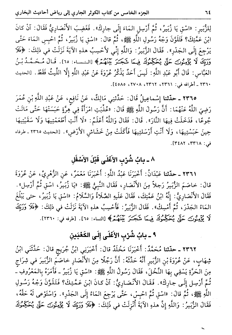 لِلزُّبَيْرِ «اسْقِ يَا زُبَيْرُ، ثُمَّ أَرْسِلِ الْمَاء إِلَى جَارِكَ». فَغَضِبَ الأَنْصَارِىُّ، فَقَالَ أَنْ كَانَ ابْنَ عَمَّتِكَ. فَتَلَوَّنَ وَجْهُ رَسُولِ اللَّهِ - صلى الله عليه وسلم - ثُمَّ قَالَ «اسْقِ يَا زُبَيْرُ، ثُمَّ احْبِسِ الْمَاءَ، حَتَّى يَرْجِعَ إِلَى الْجَدْرِ». فَقَالَ الزُّبَيْرُ وَاللَّهِ إِنِّى لأَحْسِبُ هَذِهِ الآيَةَ نَزَلَتْ فِي ذَلِكَ (فَلاَ وَرَبِّكَ لاَ يُؤْمِنُونَ حَتَّى يُحَكِّمُوكَ فِيمَا شَجَرَ بَيْنَهُمْ). أطرافه 2361، 2362، 2708، 4585