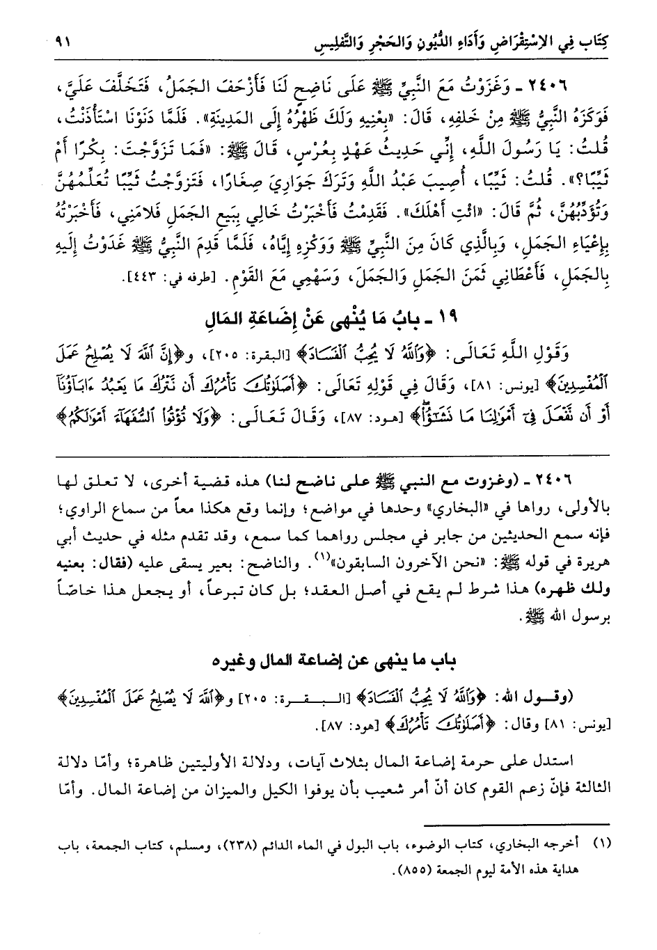 19 - باب مَا يُنْهَى عَنْ إِضَاعَةِ الْمَالِ. (19) وَقَوْلِ اللَّهِ تَعَالَى (وَاللَّهُ لاَ يُحِبُّ الْفَسَادَ) وَ (لاَ يُصْلِحُ عَمَلَ الْمُفْسِدِينَ). وَقَالَ فِي قَوْلِهِ (أَصَلَوَاتُكَ تَأْمُرُكَ أَنْ نَتْرُكَ مَا يَعْبُدُ آبَاؤُنَا أَوْ أَنْ نَفْعَلَ فِي أَمْوَالِنَا مَا نَشَاءُ). وَقَالَ (وَلاَ تُؤْتُوا السُّفَهَاءَ أَمْوَالَكُمْ)