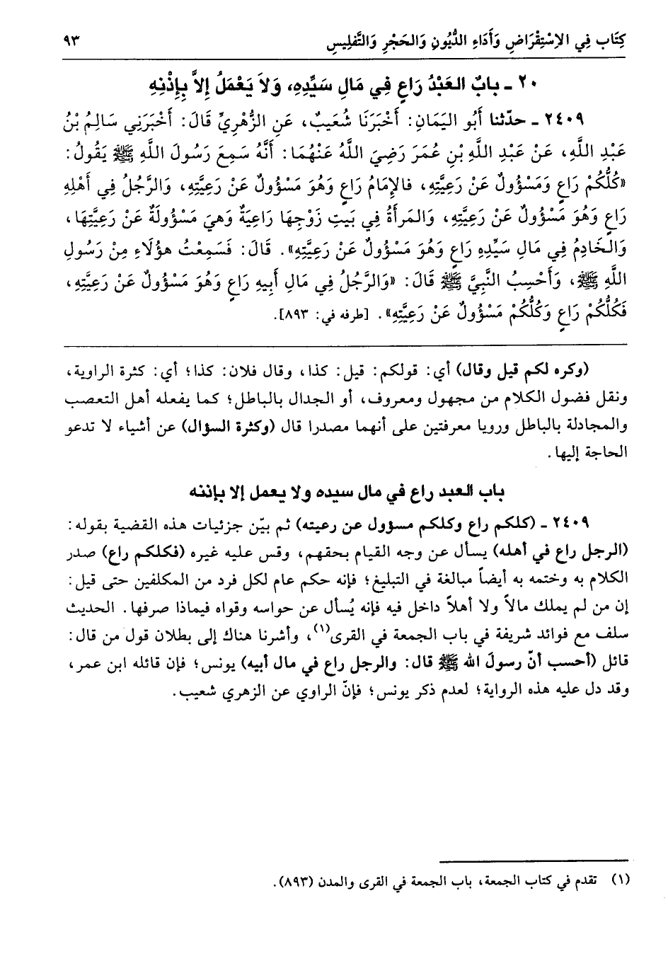 2409 - حَدَّثَنَا أَبُو الْيَمَانِ أَخْبَرَنَا شُعَيْبٌ عَنِ الزُّهْرِىِّ قَالَ أَخْبَرَنِى سَالِمُ بْنُ عَبْدِ اللَّهِ عَنْ عَبْدِ اللَّهِ بْنِ عُمَرَ - رضى الله عنهما - أَنَّهُ سَمِعَ رَسُولَ اللَّهِ - صلى الله عليه وسلم - يَقُولُ «كُلُّكُمْ رَاعٍ وَمَسْئُولٌ عَنْ رَعِيَّتِهِ، فَالإِمَامُ رَاعٍ، وَهْوَ مَسْئُولٌ عَنْ رَعِيَّتِهِ، وَالرَّجُلُ فِي أَهْلِهِ رَاعٍ، وَهْوَ مَسْئُولٌ عَنْ رَعِيَّتِهِ، وَالْمَرْأَةُ فِي بَيْتِ زَوْجِهَا رَاعِيَةٌ وَهْىَ مَسْئُولَةٌ عَنْ رَعِيَّتِهَا، وَالْخَادِمُ فِي مَالِ سَيِّدِهِ رَاعٍ، وَهْوَ مَسْئُولٌ عَنْ رَعِيَّتِهِ». قَالَ فَسَمِعْتُ هَؤُلاَءِ مِنْ رَسُولِ اللَّهِ - صلى الله عليه وسلم - وَأَحْسِبُ النَّبِىَّ - صلى الله عليه وسلم - قَالَ «وَالرَّجُلُ فِي مَالِ أَبِيهِ رَاعٍ، وَهْوَ مَسْئُولٌ عَنْ رَعِيَّتِهِ، فَكُلُّكُمْ رَاعٍ، وَكُلُّكُمْ مَسْئُولٌ عَنْ رَعِيَّتِهِ». طرفه 893