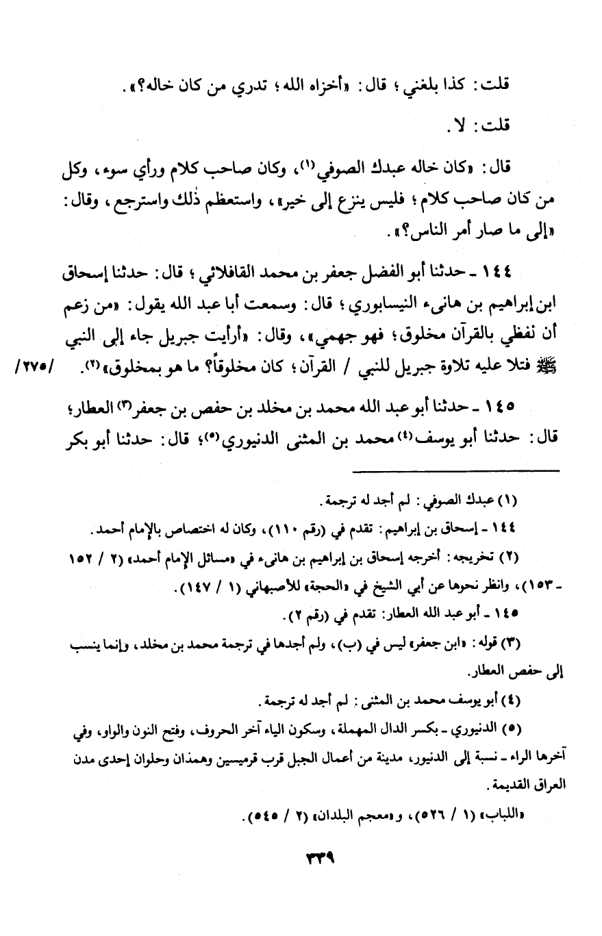 145 - حَدَّثَنَا أَبُو عَبْدِ اللَّهِ مُحَمَّدُ بْنُ مَخْلَدِ بْنِ حَفْصِ بْنِ جَعْفَرٍ الْعَطَّارُ قَالَ: حَدَّثَنَا أَبُو يُوسُفَ مُحَمَّدُ بْنُ الْمُثَنَّى الدِّينَوَرِيُّ قَالَ: حَدَّثَنَا أَبُو بَكْرٍ -[340]- مُحَمَّدُ بْنُ عِمْرَانَ بْنِ مُوسَى الدِّينَوَرِيُّ قَالَ: حَدَّثَنَا أَبُو أَحْمَدَ الْأَسَدِيُّ، قَالَ: §دَخَلْتُ عَلَى أَبِي عَبْدِ اللَّهِ أَحْمَدَ بْنِ مُحَمَّدِ بْنِ حَنْبَلٍ رَضِيَ اللَّهُ عَنْهُ وَسَأَلْتُهُ فَقُلْتُ: يَا أَبَا عَبْدِ اللَّهِ، لَفْظِي بِالْقُرْآنِ مَخْلُوقٌ أَوْ غَيْرُ مَخْلُوقٍ؟ فَمَا أَجَابَنِي بِشَيْءٍ، ثُمَّ أَعَدْتُ عَلَيْهِ الْمَسْأَلَةَ، فَمَا أَجَابَنِي فِيهَا بِشَيْءٍ، قَالَ: ثُمَّ خَرَجْتُ فِي سَفَرِي إِلَى مَكَّةَ، فَصَارَتِ الْبَادِيَةُ فِي طَرِيقِي عَلَى شِبْهِ الْحَبْسِ مِنْ شِدَّةِ الْفِكْرَةِ فِي أَمْرِهِ، قَالَ: فَدَخَلْتُ إِلَى مَكَّةَ، فَقَطَعَ بِيَ الطَّوَافُ، فَخَرَجْتُ إِلَى بِئْرِ زَمْزَمَ، وَقُبَّةِ الشَّرَابِ، فَصَلَّيْتُ فِيهَا رَكْعَتَيْنِ، ثُمَّ نَعَسْتُ فَرَأَيْتُ رَبَّ الْعِزَّةِ تَبَارَكَ وَتَعَالَى فِي -[341]- مَنَامِي، فَكَانَ آخِرَ مَا قُلْتُ لَهُ: إِلَهِي، قِرَاءَتِي بِكَلَامِكَ غَيْرُ مَخْلُوقٍ؟ قَالَ: نَعَمْ. قَالَ: فَقَوِيَ عَزْمِي، فَلَمَّا قَضَيْتُ حَجِّي وَسَفَرِي، دَخَلْتُ بَغْدَادَ وَقَدْ تَغَيَّرَ أَبُو عَبْدِ اللَّهِ تَغَيُّرًا شَدِيدًا، فَقُلْتُ لَهُ: يَا أَبَا عَبْدِ اللَّهِ لَفْظِي بِالْقُرْآنِ مَخْلُوقٌ؟ أَوْ غَيْرُ مَخْلُوقٍ؟ فَانْبَسَطَ إِلَيَّ وَقَالَ: " مَا حَالُكَ، تُوَجِّهُ الْقُرْآنَ عَلَى خَمْسِ جِهَاتٍ: حِفْظٌ بِالْقَلْبِ، وَتِلَاوَةٌ بِاللِّسَانِ، وَسَمْعٌ بِالْأُذُنِ، وَبَصَرٌ بِعَيْنٍ، وَخَطٌّ بِيَدٍ؟ " فَأَشْكَلَ عَلَيَّ قَوْلُهُ، وَبَقِيتُ فِيهِ مُتَحَيِّرًا، فقَالَ لِي: «مَا حَالُكَ، الْقَلْبُ مَخْلُوقٌ، وَالْمَحْفُوظُ بِهِ غَيْرُ مَخْلُوقٍ، وَاللِّسَانُ مَخْلُوقٌ، وَالْمَتْلُوُّ بِهِ غَيْرُ مَخْلُوقٍ، وَالْأُذُنُ مَخْلُوقٌ، وَالْمَسْمُوعُ إِلَيْهِ غَيْرُ مَخْلُوقٍ، وَالْعَيْنُ مَخْلُوقٌ، وَالْمَنْظُورُ إِلَيْهِ مِنْهُ غَيْرُ مَخْلُوقٍ»، قَالَ: فَقُلْتُ: يَا أَبَا عَبْدِ اللَّهِ الْعَيْنُ تَنْظُرُ إِلَى السَّوَادِ فِي الْوَرَقِ؟ فَقَالَ لِي: " مَهْ، أَصَحُّ شَيْءٍ فِي هَذَا خَبَرُ نَافِعٍ، عَنِ ابْنِ عُمَرَ، أَنَّ النَّبِيَّ صَلَّى اللَّهُ عَلَيْهِ وَسَلَّمَ قَالَ: «لَا تُسَافِرُوا بِالْقُرْآنِ إِلَى أَرْضِ الْعَدُوِّ»، وَلَمْ يَذْكُرْ حِبْرًا وَلَا وَرَقًا "، قَالَ: ثُمَّ رَجَعَ مَعِي إِلَى بَابِ الدَّارِ وَهُوَ يُكَلِّمُنِي بِهَذَا، إِذْ أَتَتْهُ امْرَأَةٌ مَعَهَا رَجُلٌ، فقَالَ: يَا أَبَا عَبْدِ اللَّهِ قَدْ ذَهَبَتْ إِلَى عَبْدِ الْوَهَّابِ، فَمَا أَجَابَهَا فِي الْمَسْأَلَةِ، وَتُحِبُّ أَنْ تَسْأَلَكَ، فقَالَ لَهَا: وَمَا مَسْأَلَتُكِ؟، قَالَتْ: مَسْأَلَتِي أَنَّ زَوْجِي حَلَفَ بِالطَّلَاقِ أَنَّهُ لَا يُكَلِّمُ جَارًا لَهُ سَنَةً، فَمَرَّ بِهِ بَعْدَ أَيَّامٍ وَهُوَ يَقْرَأُ فَلَحَنَ، فَرَدَّ عَلَيْهِ، قَالَ: فَحُرِّمَتْ مِنْ هَذَا إِلَى غَيْرِهِ؟ قَالَ: " لَا، قَالَ: فَاذْهَبْ فَإِنَّكَ لَمْ تَحْنَثْ، إِنَّكَ كَلَّمْتَهُ كَلَامَ الْخَالِقِ دُونَ الْمَخْلُوقِينَ "