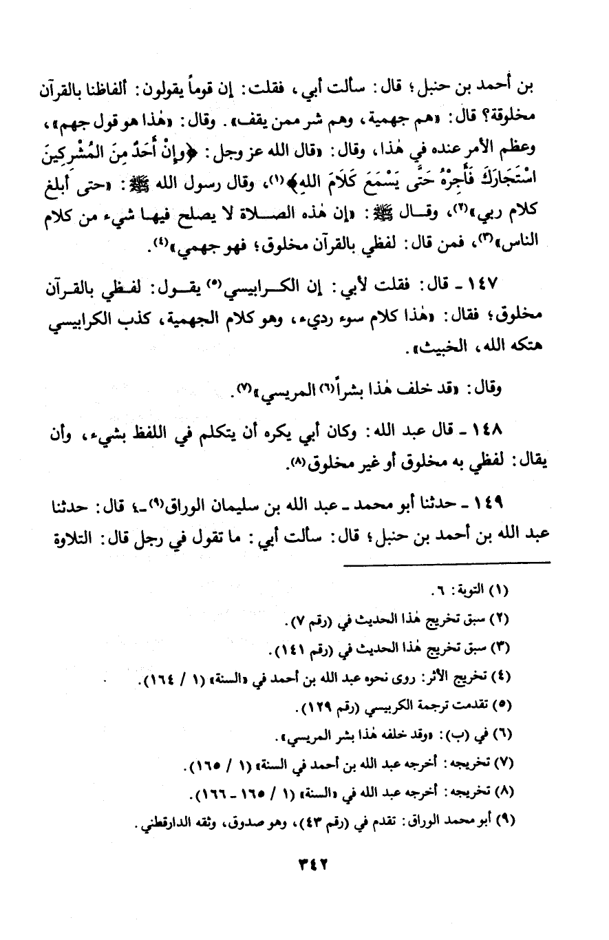 149 - حَدَّثَنَا أَبُو مُحَمَّدٍ عَبْدُ اللَّهِ بْنُ سُلَيْمَانَ الْوَرَّاقُ، قَالَ: حَدَّثَنَا عَبْدُ اللَّهِ بْنُ أَحْمَدَ بْنِ حَنْبَلٍ، قَالَ: سَأَلْتُ أَبِي: مَا تَقُولُ فِي رَجُلٍ قَالَ: التِّلَاوَةُ -[343]- مَخْلُوقَةٌ، وَأَلْفَاظُنَا بِالْقُرْآنِ مَخْلُوقَةٌ، §وَالْقُرْآنُ كَلَامُ اللَّهِ لَيْسَ بِمَخْلُوقٍ؟ قَالَ: «هَذَا كَافِرٌ، وَهُوَ فَوْقَ الْمُبْتَدِعِ، وَهَذَا كَلَامُ الْجَهْمِيَّةِ». قُلْتُ: مَا تَرَى فِي مُجَانَبَتِهِ؟ وَهَلْ يُسَمَّى مُبْتَدِعًا؟ فَقَالَ: " هَذَا يُجَانَبُ، وَهُوَ فَوْقَ الْمُبْتَدِعِ، وَهَذَا كَلَامُ الْجَهْمِيَّةِ، لَيْسَ الْقُرْآنُ بِمَخْلُوقٍ، قَالَتْ عَائِشَةُ: تَلَا رَسُولُ اللَّهِ صَلَّى اللَّهُ عَلَيْهِ وَسَلَّمَ: {هُوَ الَّذِي أَنْزَلَ عَلَيْكَ الْكِتَابَ مِنْهُ آيَاتٌ مُحْكَمَاتٌ} [آل عمران: 7]، وَالْقُرْآنُ لَيْسَ بِمَخْلُوقٍ "