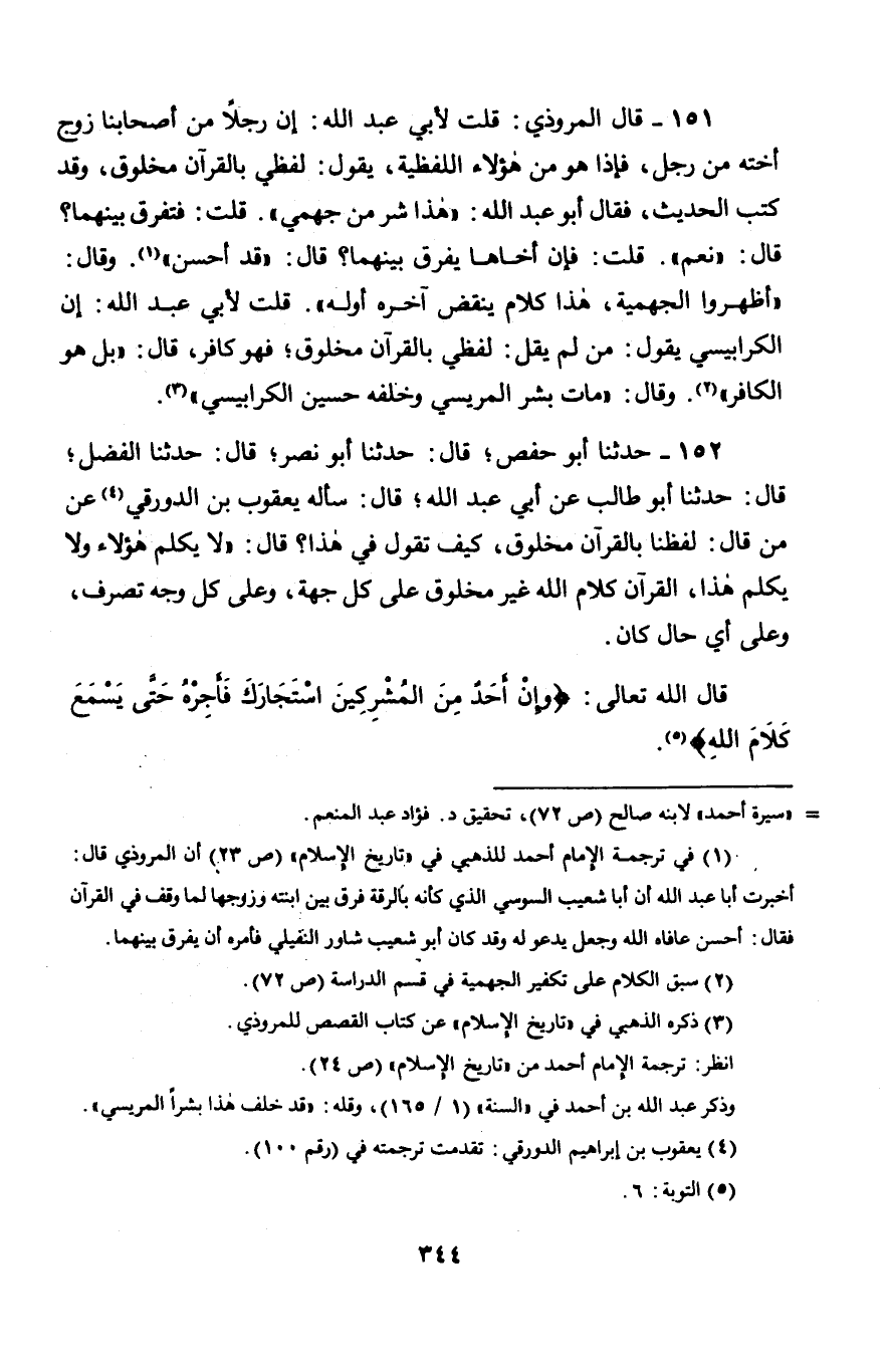 152 - حَدَّثَنَا أَبُو حَفْصٍ، قَالَ: حَدَّثَنَا أَبُو نَصْرٍ، قَالَ: حَدَّثَنَا الْفَضْلُ، قَالَ: حَدَّثَنَا أَبُو طَالِبٍ، عَنْ أَبِي عَبْدِ اللَّهِ، قَالَ: سَأَلَهُ يَعْقُوبُ بْنُ الدَّوْرَقِيِّ عَنْ مَنْ قَالَ: لَفْظُنَا بِالْقُرْآنِ مَخْلُوقٌ، كَيْفَ تَقُولُ فِي هَذَا؟ قَالَ: لَا يُكَلَّمُ هَؤُلَاءِ وَلَا يُكَلَّمُ هَذَا، §الْقُرْآنُ كَلَامُ اللَّهِ غَيْرُ مَخْلُوقٍ عَلَى كُلِّ جِهَةٍ، وَعَلَى كُلِّ وَجْهٍ تَصَرَّفَ، وَعَلَى أَيِّ حَالٍ كَانَ، قَالَ اللَّهُ تَعَالَى: {وَإِنْ أَحَدٌ مِنَ الْمُشْرِكِينَ اسْتَجَارَكَ فَأَجِرْهُ حَتَّى يَسْمَعَ كَلَامَ اللَّهِ} [التوبة: 6]. -[345]- وَقَوْلُ النَّبِيِّ صَلَّى اللَّهُ عَلَيْهِ وَسَلَّمَ: لَا يَصْلُحُ فِي الصَّلَاةِ شَيْءٌ مِنْ كَلَامِ النَّاسِ ". وَقَالَ صَلَّى اللَّهُ عَلَيْهِ وَسَلَّمَ: حَتَّى أُبَلِّغَ كَلَامَ رَبِّي. هَذَا قَوْلُ جَهْمٍ، عَلَى مَنْ جَاءَ بِهَذَا غَضَبُ اللَّهِ "
