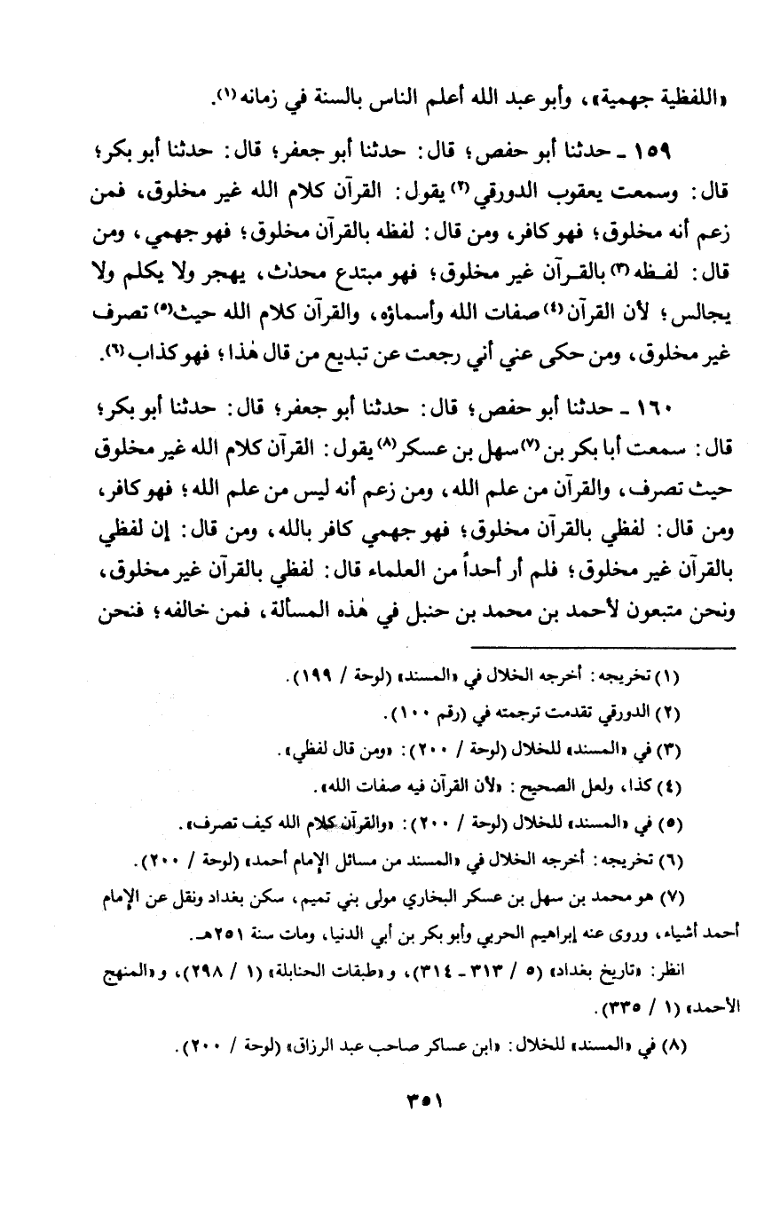 160 - حَدَّثَنَا أَبُو حَفْصٍ، قَالَ: حَدَّثَنَا أَبُو جَعْفَرٍ، قَالَ: حَدَّثَنَا أَبُو بَكْرٍ، قَالَ: سَمِعْتُ أَبَا بَكْرِ بْنَ سَهْلِ بْنِ عَسْكَرٍ، يَقُولُ: " §الْقُرْآنُ كَلَامُ اللَّهِ غَيْرُ مَخْلُوقٍ حَيْثُ تَصَرَّفَ، وَالْقُرْآنُ مِنْ عِلْمِ اللَّهِ، وَمَنْ زَعَمَ أَنَّهُ لَيْسَ مِنْ عِلْمِ اللَّهِ، فَهُوَ كَافِرٌ، وَمَنْ قَالَ: لَفْظِي بِالْقُرْآنِ مَخْلُوقٌ فَهُوَ جَهْمِيٌّ كَافِرٌ بِاللَّهِ، وَمَنْ قَالَ: إِنَّ لَفْظِي بِالْقُرْآنِ غَيْرُ مَخْلُوقٍ، فَلَمْ أَرَ أَحَدًا مِنَ الْعُلَمَاءِ قَالَ: لَفْظِي بِالْقُرْآنِ غَيْرُ مَخْلُوقٍ، وَنَحْنُ مُتَّبِعُونَ لِأَحْمَدَ بْنِ مُحَمَّدِ بْنِ حَنْبَلٍ فِي هَذِهِ الْمَسْأَلَةِ، فَمَنْ خَالَفَهُ فَنَحْنُ -[352]- مِنْهُ بَرِيئُونَ فِي الدُّنْيَا وَالْآخِرَةِ، سَمِعْتُ عَبْدَ الرَّزَّاقِ يَقُولُ: إِنْ يَعِشْ هَذَا الرَّجُلُ يَكُنْ خَلَفًا مِنَ الْعُلَمَاءِ، يُرِيدُ أَحْمَدَ بْنَ حَنْبَلٍ، رَحِمَهُ اللَّهُ "